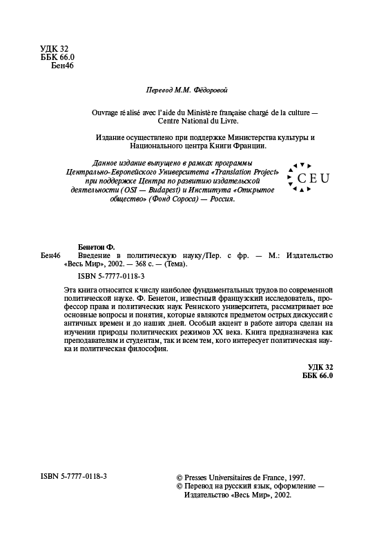 Эта книга относится к числу наиболее фундаментальных трудов по современной политической науке. Ф. Бенетон, известный французский исследователь, профессор права и политических наук Рейнского университета, рассматривает все основные вопросы и понятия, которые являются предметом острых дискуссий с античных времен и до наших дней. Особый акцент в работе автора сделан на изучении природы политических режимов XX века. Книга предназначена как преподавателям и студентам, так и всем тем, кого интересует политическая наука и политическая философия.