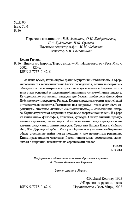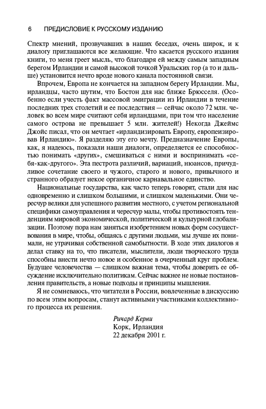 «В наше время, когда старые границы утратили незыблемость, а сформировавшиеся геополитические блоки распадаются, возникла острая необходимость пересмотреть все прежние представления о Европе» — эта тема стала основной в предлагаемой вниманию читателей книге-диалоге. Ее содержание составляют двадцать две беседы профессора философии Дублинского университета Ричарда Керни с представителями европейской интеллектуальной элиты. Размышляя над вопросами: что значит «быть европейцем», что такое «нация» и «национальность», — собеседники Ричарда Керни затрагивают острейшие проблемы современной жизни. В сфере их внимания — философия, политика, культура. Спектр мнений, прозвучавших в диалогах, очень широк. И это естественно, ведь в дискуссию вовлечены люди самых разных взглядов. Среди них Вацлав Гавел и Умберто Эко, Жак Деррида и Герберт Маркузе. Однако всех участников объединяет общее стремление найти новые подходы к уже привычным решениям. Книга предоставляет читателям России уникальную возможность включиться в широкий, действительно европейский диалог.