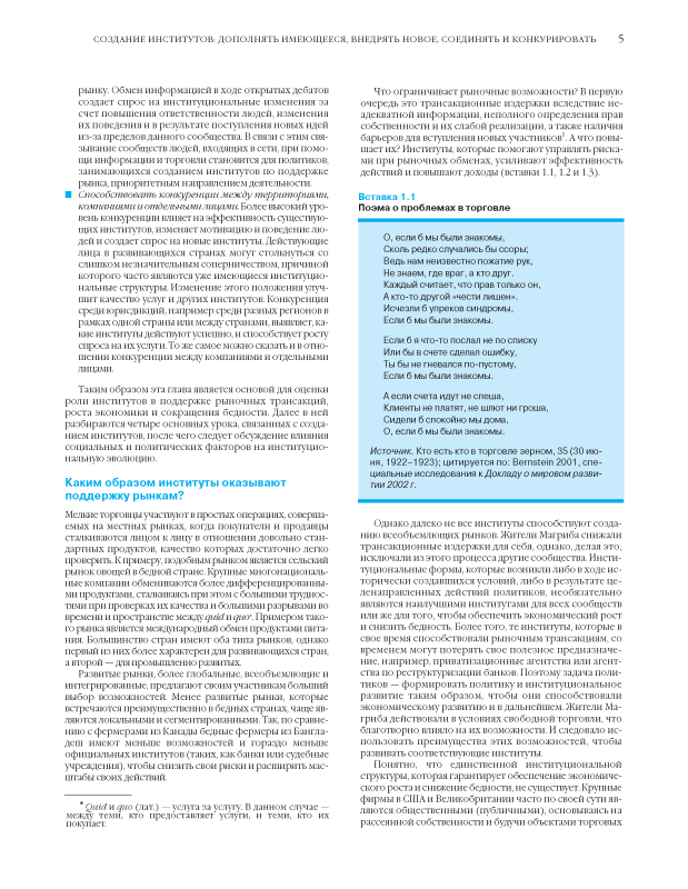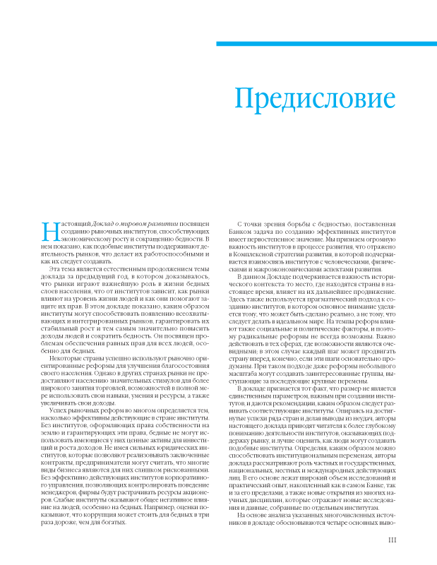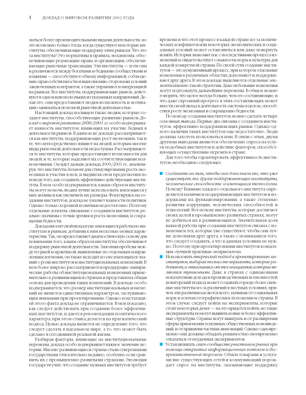 - Настоящий Доклад о мировом развитии посвящен созданию рыночных институтов, способствующих экономическому росту и сокращению бедности. В нем показано, как подобные институты поддерживают деятельность рынков, что делает их работоспособными и как их следует создавать. Эта...