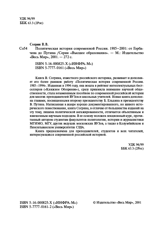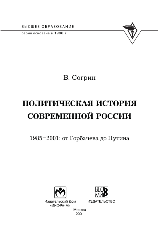 Книга В. Согрина, известного российского историка, развивает и дополняет его более раннюю работу «Политическая история современной России. 1985-1994». Изданная в 1994 году, она вошла в рейтинг интеллектуальных бестселлеров («Книжное Обозрение»), сразу привлекла внимание научной общественности, стала незаменимым пособием по современной российской истории для многих преподавателей ВУЗов и школьных учителей. Новая книга дополнена главами, посвященными второму президентству Б. Ельцина и президентству В. Путина. Написанная в жанре хорошо документированного, но живого исторического повествования, книга Согрина, в отличие от большинства изданий на эту тему, лишена политической ангажированности, отличается объективным и взвешенным научным подходом. В ее основу положен лекционный курс, прочитанный автором студентам факультетов политологии, истории и журналистики МГИМО, МГУ, других ведущих московских ВУЗов, атакже в Колумбийском и Пенсильванском университетах США.