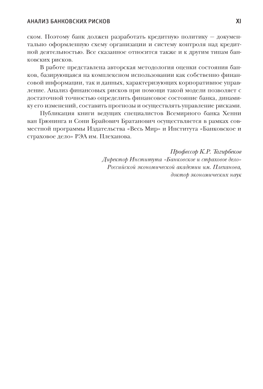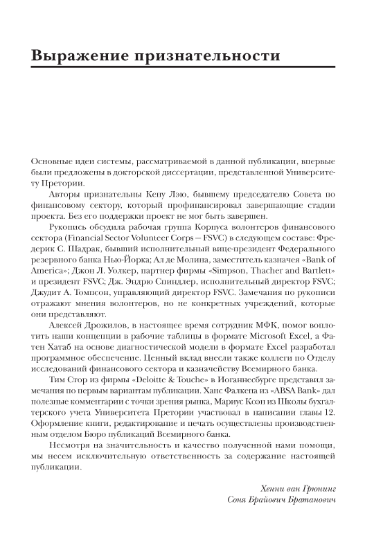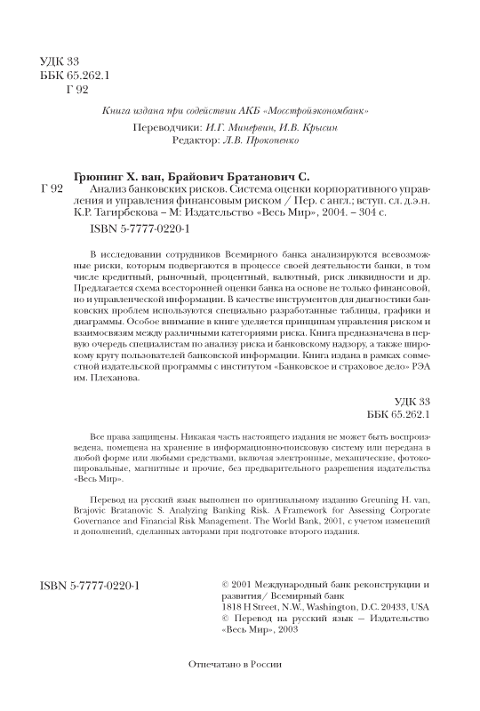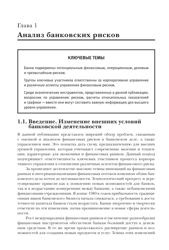 В исследовании сотрудников Всемирного банка анализируются всевозможные риски, которым подвергаются в процессе своей деятельности банки, в том числе кредитный, рыночный, процентный, валютный, риск ликвидности и др. Предлагается схема всесторонней оценки банка на основе не только финансовой, но и управленческой информации. В качестве инструментов для диагностики банковских проблем используются специально разработанные таблицы, графики и диаграммы. Особое внимание в книге уделяется принципам управления риском и взаимосвязям между различными категориями риска. Книга предназначена в первую очередь специалистам по анализу риска и банковскому надзору, а также широкому кругу пользователей банковской информации. Книга издана в рамках совместной издательской программы с институтом «Банковское и страховое дело» РЭА им. Плеханова.