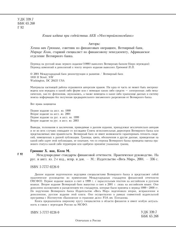 Данное издание подготовлено ведущими специалистами Всемирного банка и представляет собой практическое руководство по применению Международных стандартов финансовой отчетности (МСФО). Первое издание вышло в свет в 1999 г. с параллельным текстом на английском и русском языках. Второе издание Всемирный банк выпустил в свет в 2001 г. лишь на английском языке. Оно дополнено изложением и разъяснением тех стандартов, которые были приняты в период 1999 — 2000 гг. По поручению Всемирного банка Издательство «Весь Мир» подготовило второе, исправленное и дополненное, русское издание этой книги. Оно осуществлено в рамках совместной издательской программы с Институтом «Банковское и страховое дело» РЭА им. Плеханова