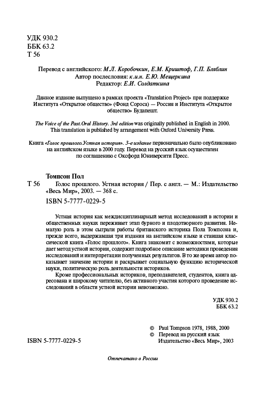 Устная история как междисциплинарный метод исследований в истории и общественных науках переживает этап бурного и плодотворного развития. Немалую роль в этом сыграли работы британского историка Пола Томпсона и, прежде всего, выдержавшая три издания на английском языке и ставшая классической книга «Голос прошлого». Книга знакомит с возможностями, которые дает метод устной истории, содержит подробное описание методики проведения исследований и интерпретации полученных результатов. В то же время автор показывает значение истории и раскрывает социальную функцию исторической науки, политическую роль деятельности историков.