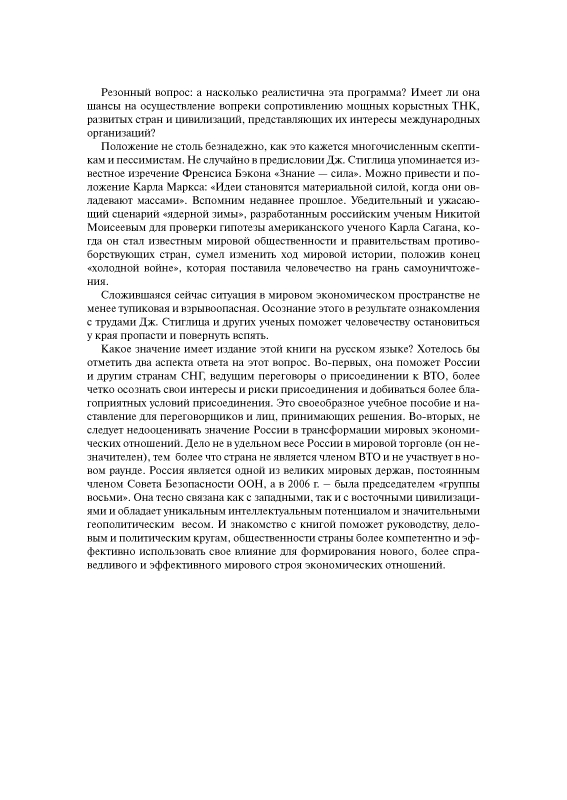 Профессор Колумбийского университета Джозеф Стиглиц наверное самый информированный (как бывший главный экономист Всемирного банка) и самый титулованный (Нобелевский лауреат 2001 года по экономике) критик политики международных финансовых организаций. Он много раз предупреждал об опасности для России вступления во Всемирную торговую организацию.