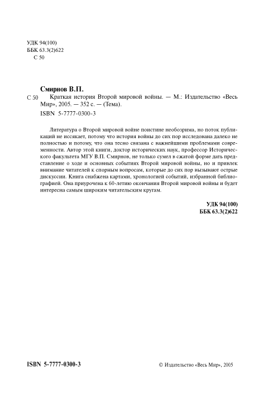 Литература о Второй мировой войне поистине необозрима, но поток публикаций не иссякает, потому что история войны до сих пор исследована далеко не полностью и потому, что она тесно связана с важнейшими проблемами современности. Автор этой книги, доктор исторических наук, профессор Исторического факультета МГУ В.П. Смирнов, не только сумел в сжатой форме дать представление о ходе и основных событиях Второй мировой войны, но и привлек внимание читателей к спорным вопросам, которые до сих пор вызывают острые дискуссии. Книга снабжена картами, хронологией событий, избранной библиографией. Она приурочена к 60-летию окончания Второй мировой войны и будет интересна самым широким читательским кругам.