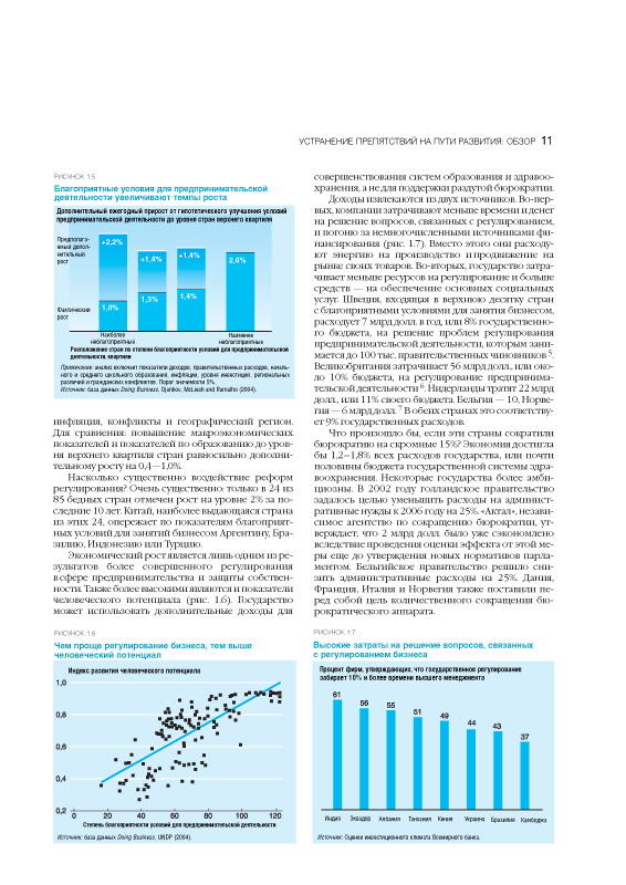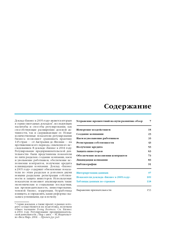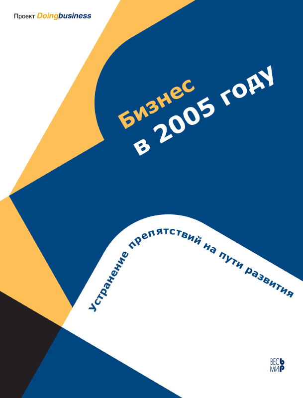 Доклад «Бизнес в 2005 году» является вторым в серии ежегодных докладов Всемирного банка по проблемам регулирования деловой активности (проект Doing Business) и посвящен преодолению препятствий для развития среднего и малого бизнеса. Настоящее издание содержит анализ и сравнение условий развития бизнеса по 135 странам. В докладе представлены обновленные показатели по разделам доклада 2004 года — создание и закрытие компании, наем и увольнение работников, исполнение договоров, получение кредита — а также включены два новых раздела: регистрация собственности и защита инвесторов. Оценки, приведенные в докладе, опираются на данные масштабных исследований, проведенных в разных странах экспертами консалтинговых, аудиторских и аналитических фирм — партнеров Всемирного банка.