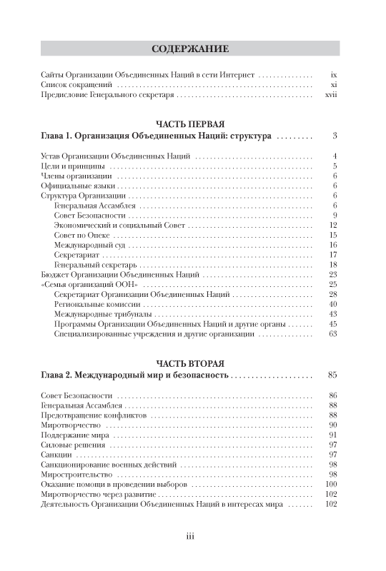 Справочник состоит из трех частей, в которых рассказывается о структуре и функциях основных органов, специализированных учреждений и должностных лиц ООН, дается обзор деятельности Всемирной организации по конкретным магистральным направлениям политического и экономического развития. Последняя часть представляет информацию в табличной форме.