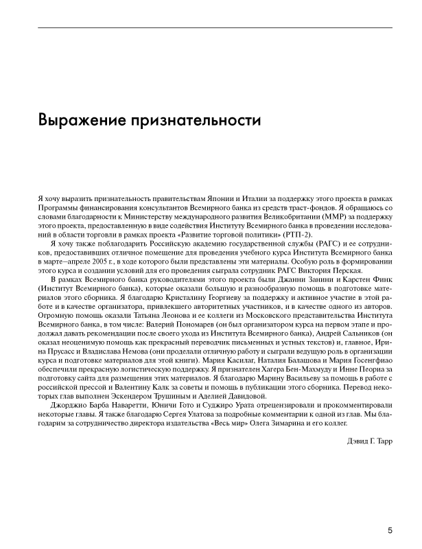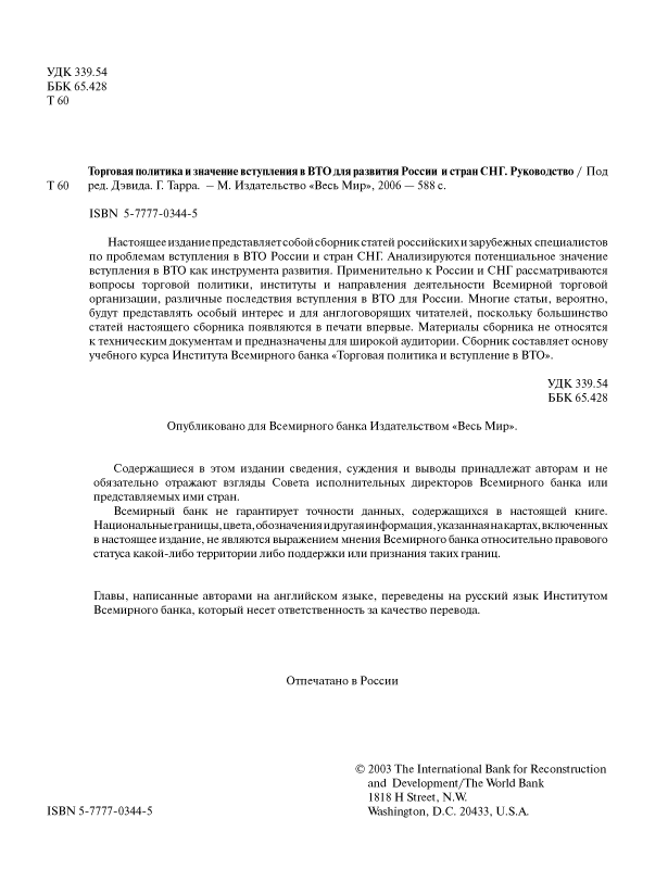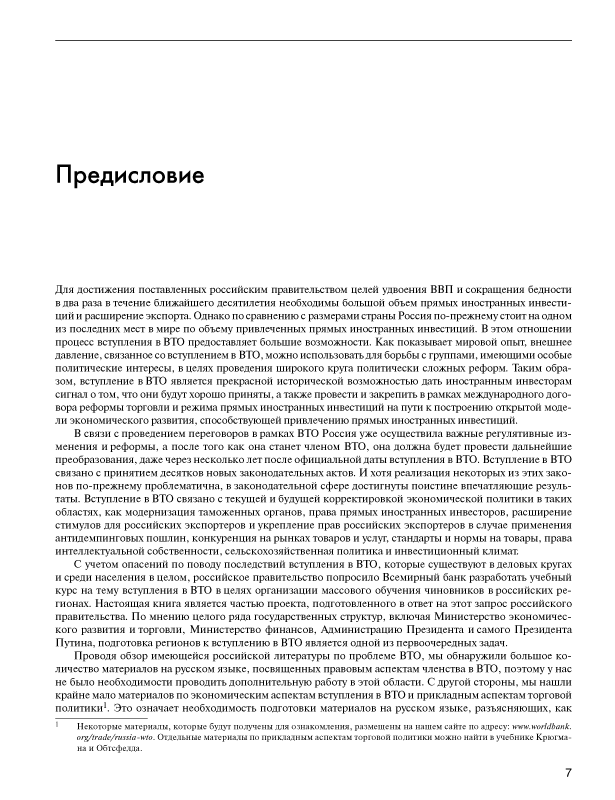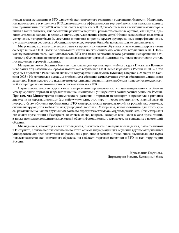Настоящее издание представляет собой сборник статей российских и зарубежных специалистов по проблемам вступления в ВТО России и стран СНГ. Анализируются потенциальное значение вступления в ВТО как инструмента развития. Применительно к России и СНГ рассматриваются вопросы торговой политики, институты и направления деятельности Всемирной торговой организации, различные последствия вступления в ВТО для России. Многие статьи, вероятно, будут представлять особый интерес и для англоговорящих читателей, поскольку большинство статей настоящего сборника появляются в печати впервые. Материалы сборника не относятся к техническим документам и предназначены для широкой аудитории. Сборник составляет основу учебного курса Института Всемирного банка «Торговая политика и вступление в ВТО».