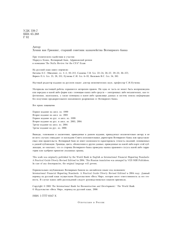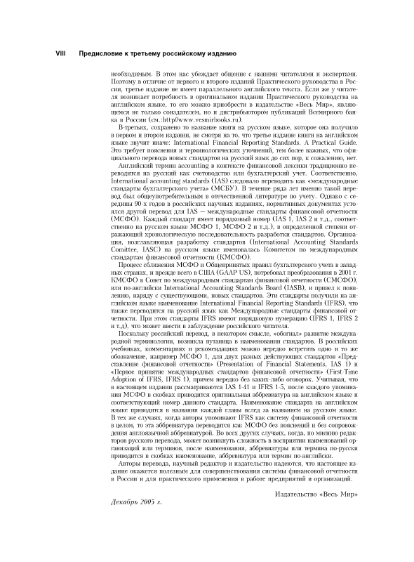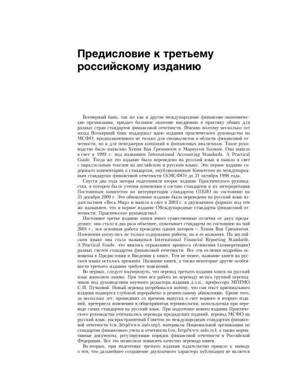 Практическое руководство по применению международных стандартов финансовой отчетности (как IAS, так и IFRS) было впервые подготовлено Всемирным банком в 1999 г. и с тех пор пользуется заслуженной репутацией одного из самых надежных и полезных пособий по применению МСФО в разных странах мира, в том числе и в России. Его особенность в том, что, будучи доступным сводным пособием, оно ориентировано не только на специалистов в области учета, но и на менеджеров без специальной бухгалтерской подготовки. Новое издание, вышедшее в свет на английском языке в канун 2005 года, существенно расширено и обновлено. Издание отражает процесс сближения стандартов финансовой отчетности, принятых в США и Европе. Структура книги стала значительно более удобной, а комментарии автора более подробными. Расширен круг примеров, иллюстрирующих авторское изложение. Перевод книги на русский язык выполнен группой специалистов под руководством докт. эк. наук С. И. Пучковой (МГИМО (университет) МИД России).