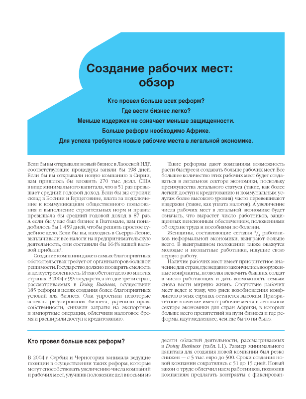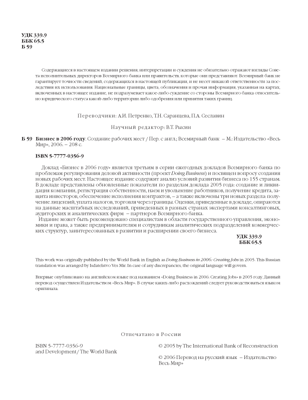 Доклад «Бизнес в 2006 году» является третьим в серии ежегодных докладов Всемирного банка по проблемам регулирования деловой активности (проект Doing Business) и посвящен вопросу создания новых рабочих мест. Настоящее издание содержит анализ условий развития бизнеса по 155 странам. В докладе представлены обновленные показатели по разделам доклада 2005 года: создание и ликвидация компании, регистрация собственности, наем и увольнение работников, получение кредита, защита инвесторов, обеспечение исполнения контрактов, — а также включены три новых раздела: получение лицензий, уплата налогов, торговля через границы. Оценки, приведенные в докладе, опираются на данные масштабных исследований, приведенных в разных странах экспертами консалтинговых, аудиторских и аналитических фирм — партнеров Всемирного банка.