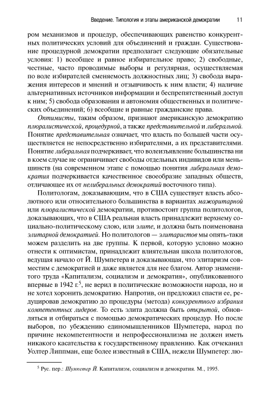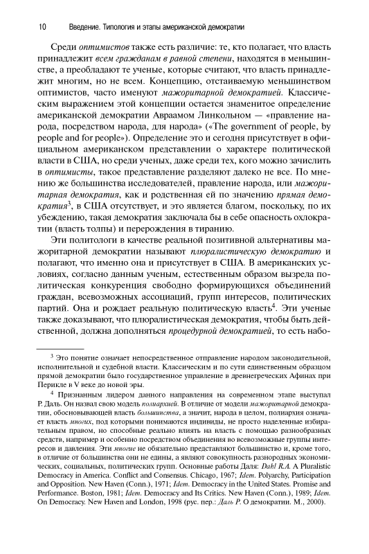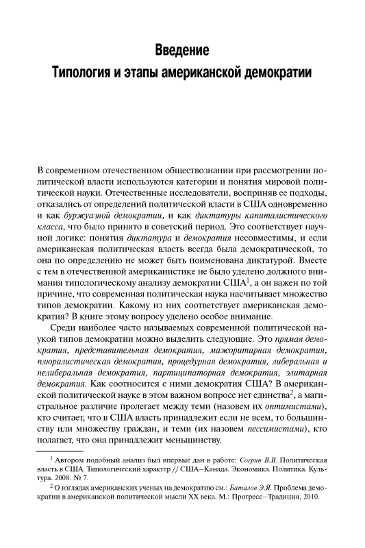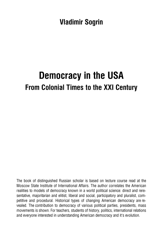 Оригинальность автора в контексте как отечественной, так и мировой обществоведческой литературы заключается в сопоставлении американской демократии с целым спектром демократических моделей, известных политической науке. Это прямая и представительная, мажоритарная и элитарная, либеральная и социальная, партиципаторная и плюралистическая, конкурентная и процедурная демократия. Глубина сравнительно-исторического и типологического анализа американской демократии сочетается с ясностью изложения, что делает книгу интересной и доступной широким кругам читателей.