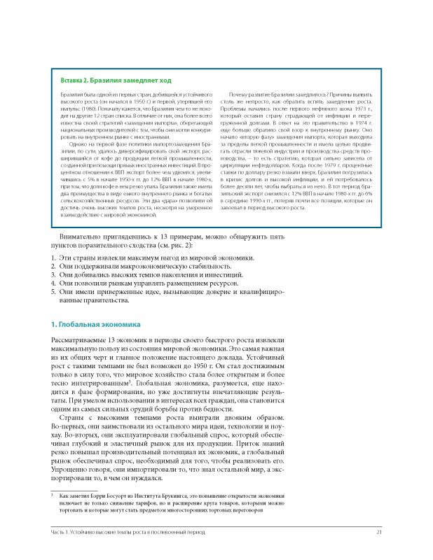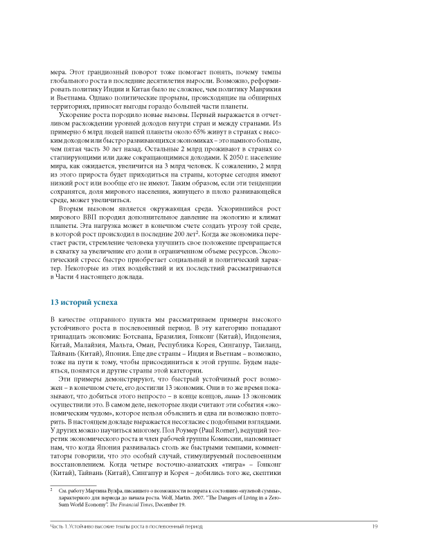 • Доклад выявляет отличительные особенности быстрорастущих экономик и задается вопросом, каким образом другие развивающиеся страны могли бы воспроизвести их. Он не содержит формулы, которую могли бы на практике применить политические деятели — подобной общей формулы и не существует. У каждой страны...