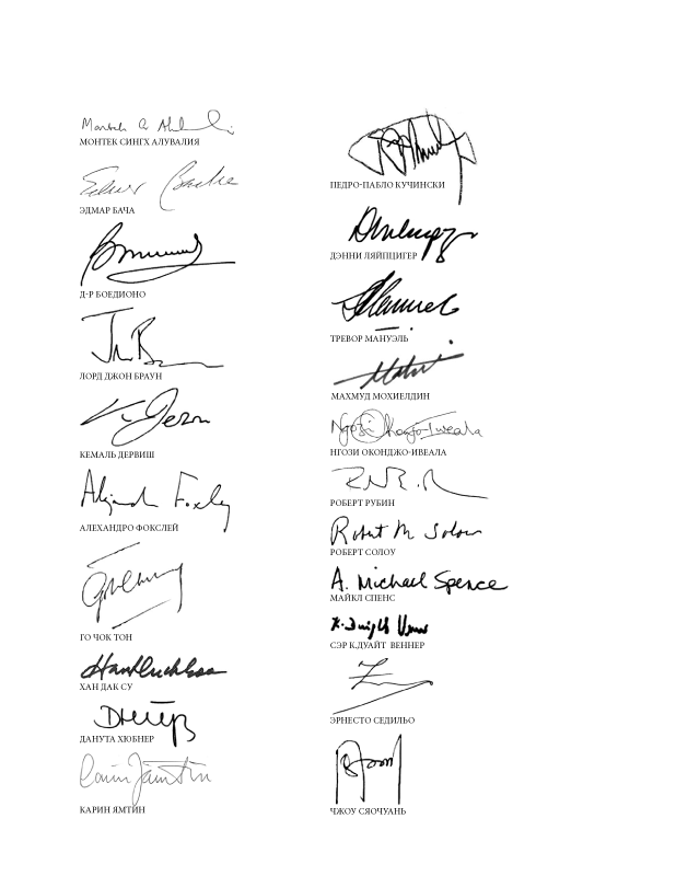 • В настоящем докладе обобщены взгляды Комиссии по росту и развитию, в состав которой входят 19 руководителей, представляющих преимущественно развивающиеся страны, и двое ученых — Боб Солоу и я. За плечами руководителей — десятилетия напряженной работы по проведению политики, которая влияет на жизнь...