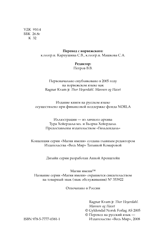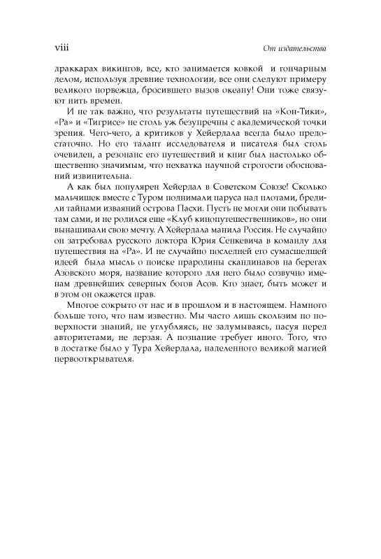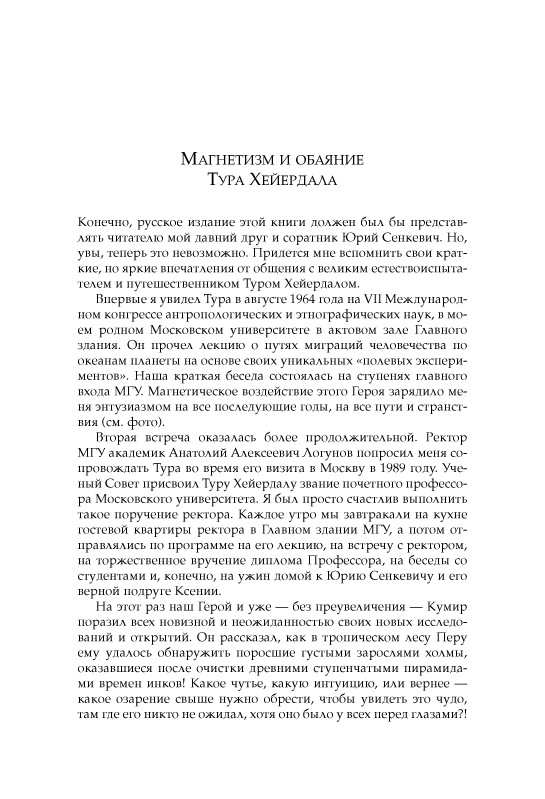 - Конечно, русское издание этой книги должен был бы представлять читателю мой давний друг и соратник Юрий Сенкевич. Но, увы, теперь это невозможно. Придется мне вспомнить свои краткие, но яркие впечатления от общения с великим естествоиспытателем и путешественником Туром Хейердалом. Впервые я увидел Тура...