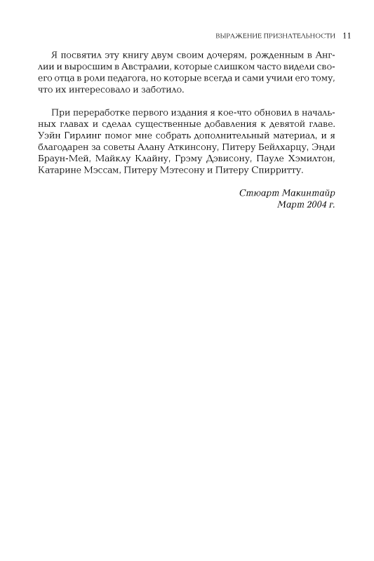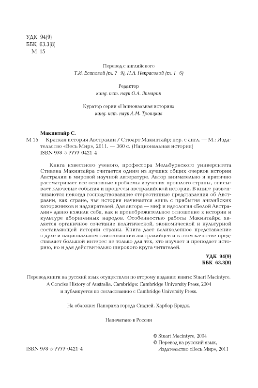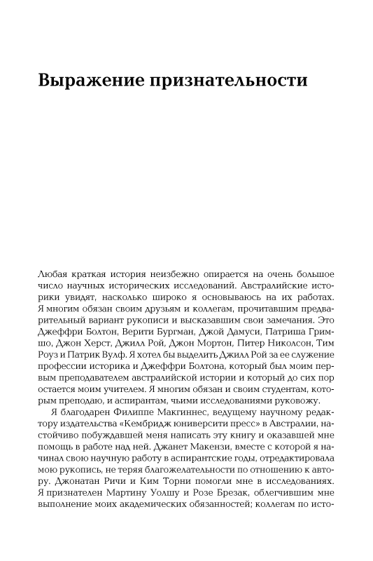 Книга известного ученого, профессора Мельбурнского университета Стюарта Макинтайра считается одним из лучших общих очерков истории Австралии в мировой научной литературе. Автор внимательно и критично рассматривает все основные проблемы изучения прошлого страны, описывает ключевые события и процессы австралийской истории. В книге развенчиваются некогда господствовавшие стереотипные представления об Австралии, как стране, чья история начинается лишь с прибытия английских каторжников и надзирателей. Для автора — миф и идеология «Белой Австралии» давно изжили себя, как и пренебрежительное отношение к истории и культуре аборигенных народов. Особенностью работы Макинтайра является органичное сочетание политической, экономической и культурной составляющей истории страны. Книга дает великолепное представление о духе и национальном самосознании австралийцев и в этом качестве представляет большой интерес не только для тех, кто изучает и преподает историю, но и для действительно широкого круга читателей.