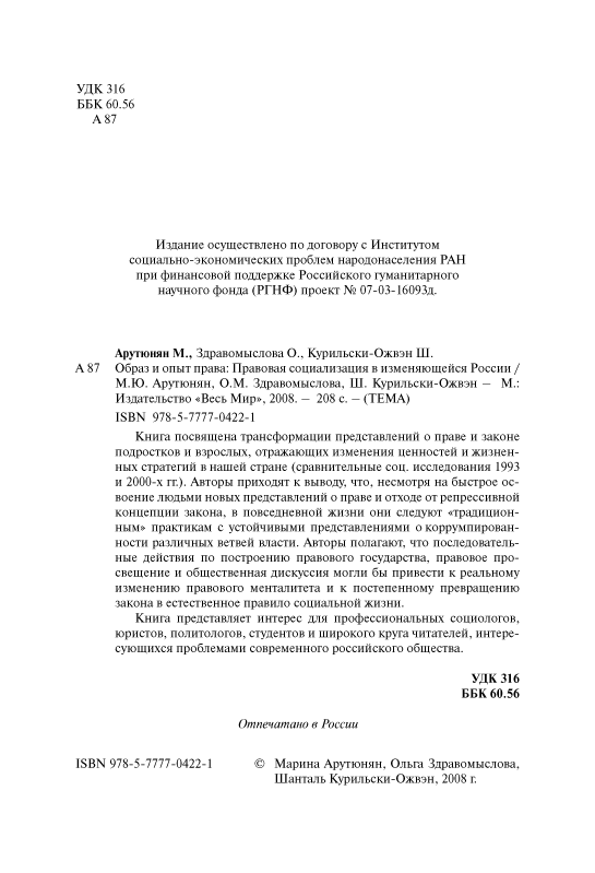 Книга представляет интерес для профессиональных социологов, юристов, политологов, студентов и широкого круга читателей, интересующихся проблемами современного российского общества.