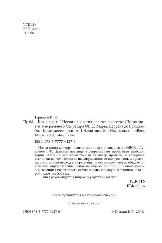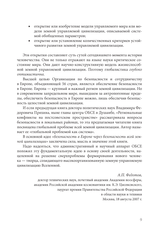 Новая книга доктора политических наук, главы центра ОБСЕ в Душанбе В. Ф. Пряхина посвящена современным проблемам глобализации. Автор видит комплексный характер проблем, с которыми сталкивается человечество на современном этапе развития, и предлагает системный подход к их решению. В его основе — новое общечеловеческое мировоззрение, основывающееся на принципиально новом осмыслении качественного скачка в развитии науки и техники во второй половине ХХ века.