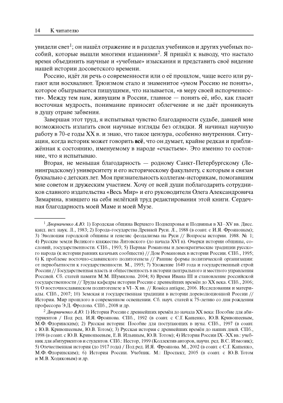 Книга профессора А.Ю. Дворниченко, декана исторического факультета Санкт-Петербургского университета, охватывает всю русскую историю до 1917 г. Многолетние научные исследования автора и огромный опыт преподавания курса русской истории в ведущем университете страны позволили создать и увлекательно изложить новаторскую концепцию русской истории. Автор придерживается представлений о догосударственном характере Киевской Руси, сравнительно позднем формировании российского государства (XV–XVI вв.), о ключевой роли сложившегося в XVII в. самодержавного государственно-крепостнического строя (ГКС). Несмотря на то что автор именует книгу «учебным пособием», она представляет собой оригинальную и глубоко научную работу, впитавшую новейшие достижения отечественной и мировой исторической науки.