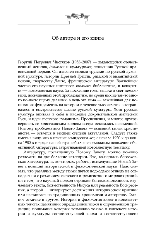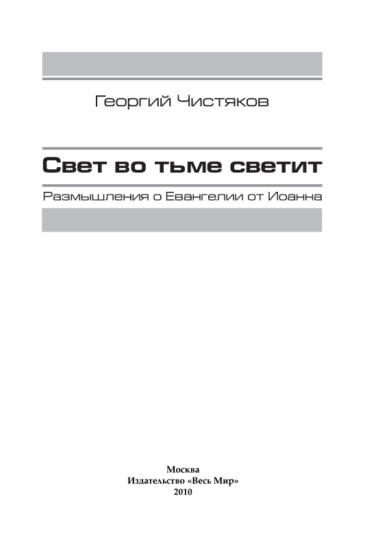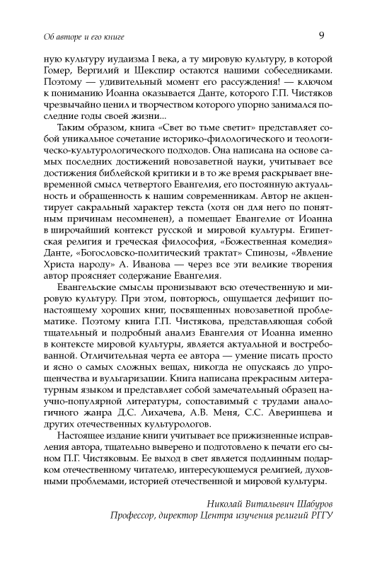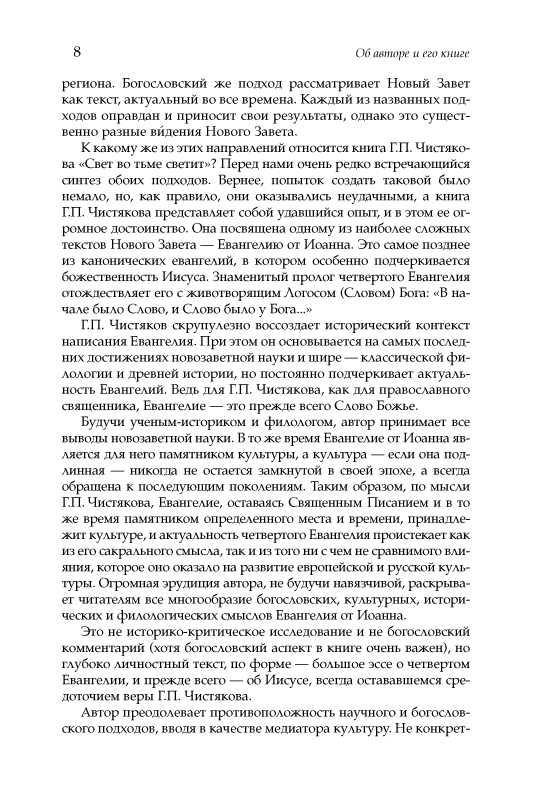Книга выдающегося отечественного историка, филолога и культуролога, священника Русской православной церкви Г.П. Чистякова посвящена одному из наиболее сложных текстов Нового Завета — Евангелию от Иоанна. По своему жанру это большое эссе, удачно синтезирующее теологическо-культурологический и историко-филологический подходы к текстам Нового Завета. Она написана на основе самых последних достижений новозаветной науки, учитывает все достижения библейской критики и в то же время раскрывает вневременной смысл четвертого Евангелия, его постоянную актуальность и обращенность к нашим современникам. Книга написана прекрасным литературным языком и представляет собой выдающийся образец научно-популярной литературы, сопоставимой с трудами аналогичного жанра Д.С. Лихачева, А.В. Меня, С.С. Аверинцева и других отечественных культурологов.