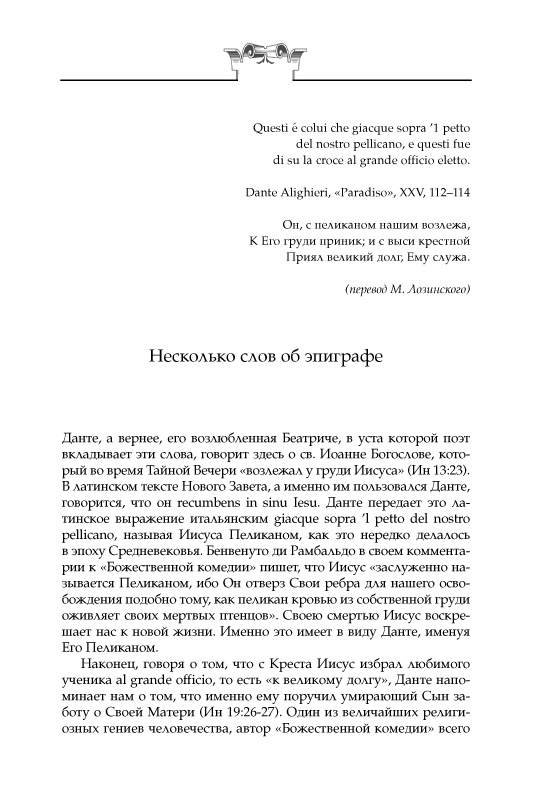 - Questi é colui che giacque sopra ’l petto del nostro pellicano, e questi fue di su la croce al grande officio eletto. Dante Alighieri, «Paradiso», XXV, 112–114 Он, с пеликаном нашим возлежа, К Его груди приник; и с выси крестной Приял...