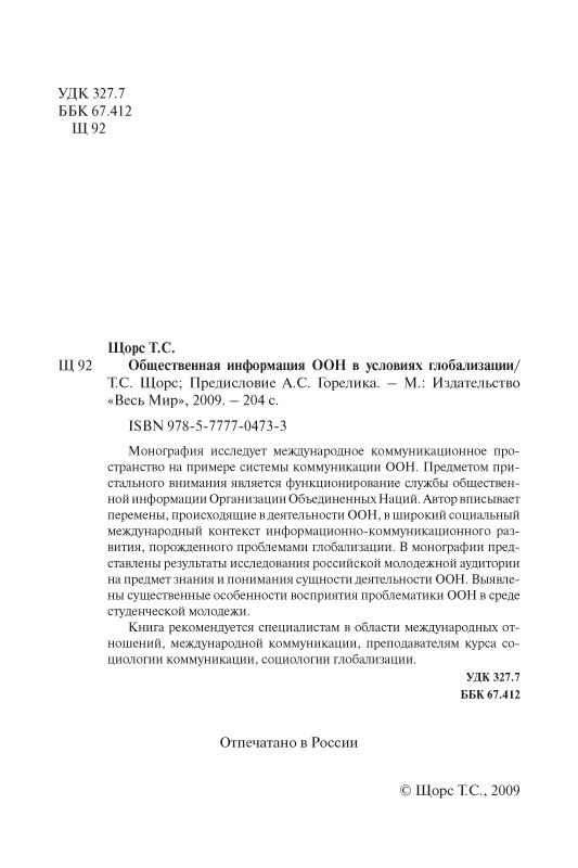 - Эта книга — одно из первых известных мне серьезных исследований международного коммуникационного пространства на примере функционирования службы общественной информации Организации Объединенных Наций. Татьяна Шорс права, рассматривая ООН в целом в качестве института международной политической коммуникации...