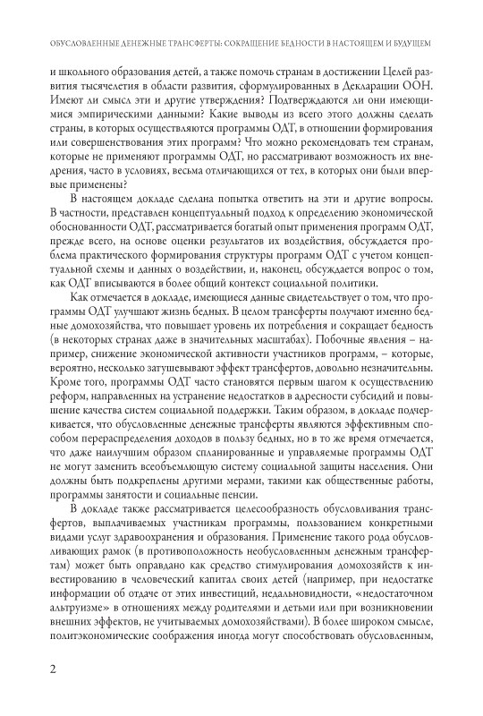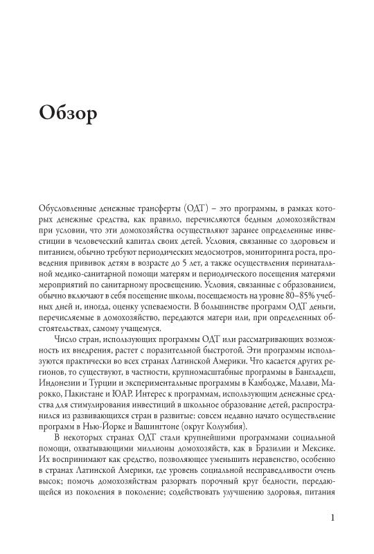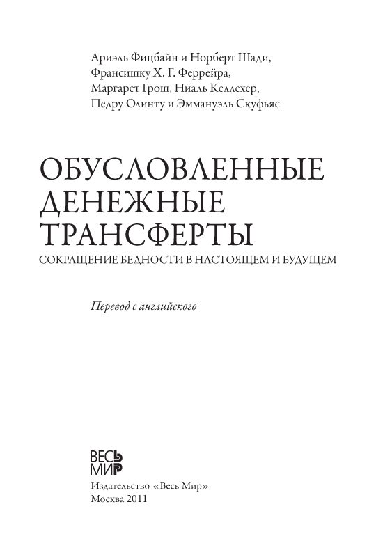 В книге «Обусловленные денежные трансферты» содержится точная и взвешенная оценка знаний, накопленных на сегодняшний день в области программ обусловленных денежных трансфертов. Она послужит источником информации и ориентиром для ученых-экономистов и разработчиков политики при запуске, расширении и оценке программ этого характера. Кроме того, книга поднимает важные вопросы, которым, на мой взгляд, уделяется недостаточное внимание, а именно, о необходимости рассматривать эти программы в более общем контексте социальной политики стран. Фицбайн и Шади написали очень ценную и своевременную книгу для всех, кто интересуется проблемами бедности.