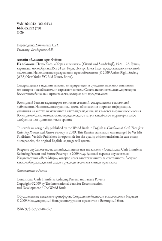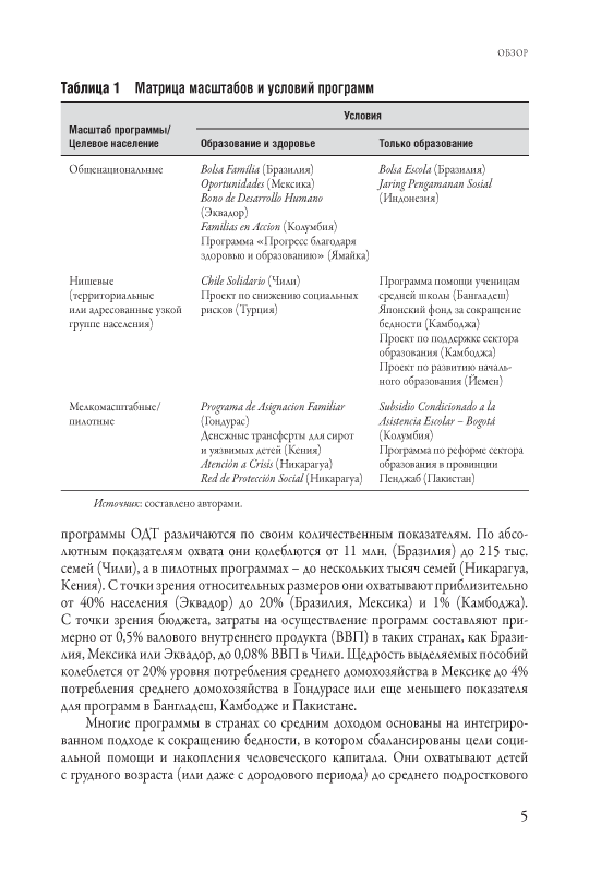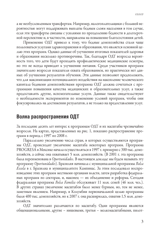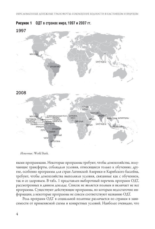 Анализируются данные об обусловленных денежных трансфертах (ОДТ ) – программах социальной защиты, которые за последнее десятилетие приобрели популярность во многих развивающихся странах. Крупнейшие программы ОДТ , такие, как Bolsa Família в Бразилии и Oportunidades в Мексике, охватывают миллионы домохозяйств. Рассмотрено влияние ОДТ на текущие показатели бедности, образования, здоровья и питания. Доклад опирается на тщательно выверенные национальные и международные оценки.