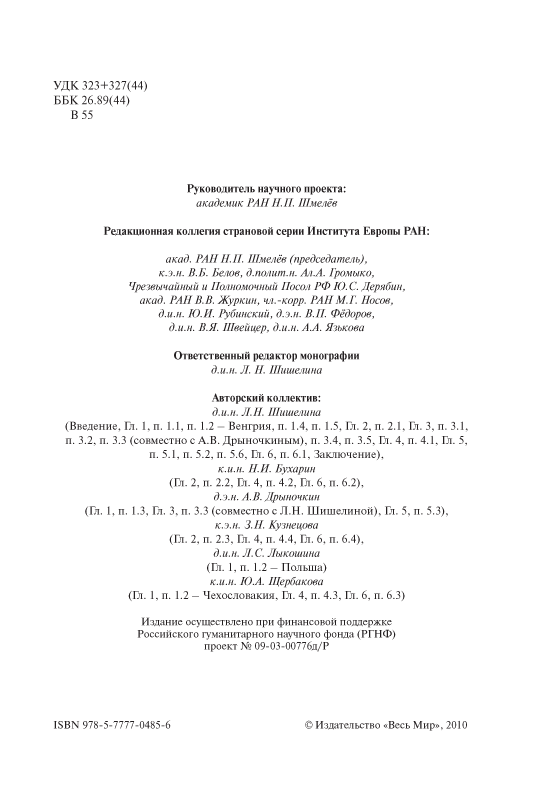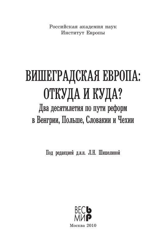 - Visegrad Europe: Where From — Where To? Twenty Years on the Path of Reforms in Hungary, Poland, Slovakia and Czech Republic. By Lybov Shishelina (Ed.), Nikolai Bukharin, Alexey Drynochkin, Zoya Kuznetsova, Larisa Lukoshina, Yulia Scherbakova. Moscow, VES MIR, 2010. P. 564...
