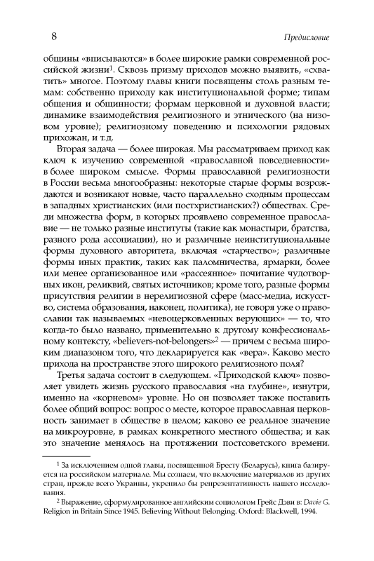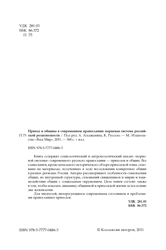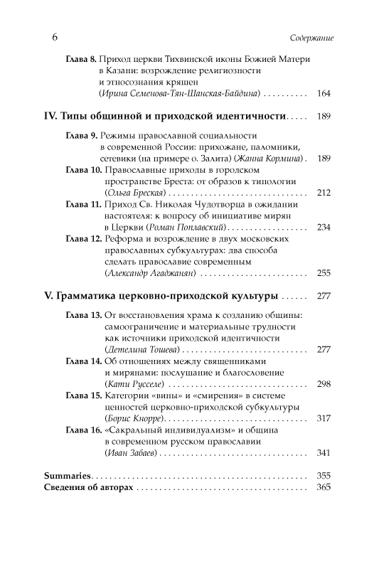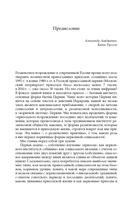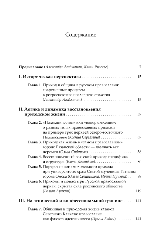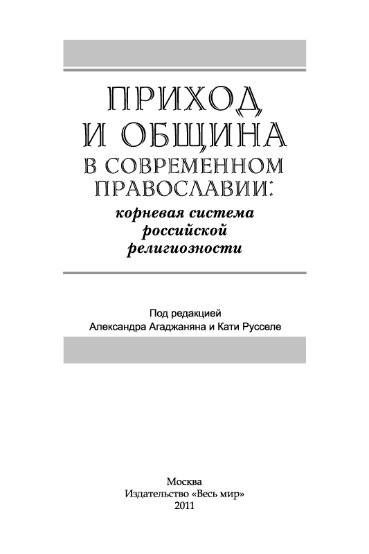 Книга содержит социологический и антропологический анализ «корневой системы» современного русского православия — приходов и общин. Все главы книги, кроме начального исторического обзора приходской темы, основаны на материалах, полученных в ходе исследования конкретных общин в разных регионах России. Авторы рассматривают особенности становления общин, их внутренней структуры, отношений священников и мирян и взаимодействия общин с социальным окружением. Цель книги состоит также в том, чтобы показать динамику общинной и приходской жизни за последние два десятилетия.