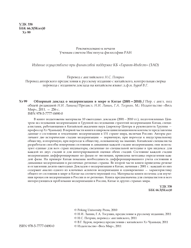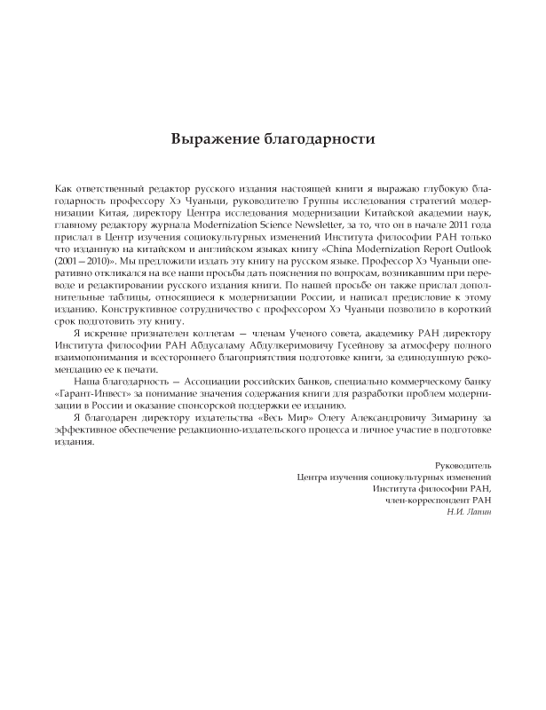 Состояние каждой стадии модернизации дифференцировано по фазам ее эволюции, приведена методика определения каждой фазы. На примере Китая показана необходимость дифференцированного учета состояния и динамики модернизации в различных регионах страны. Во второй части книги приведены резюме и оглавления десяти ежегодных Докладов о модернизации в Китае, начиная с 2001 г.: каждый из них содержит анализ одного из ключевых аспектов модернизации и одновременно — характеристику общего ее состояния в мире и Китае на соответствующий год. Материалы книги полезны для изучения процессов модернизации в России и ее регионах. Книга предназначена для специалистов и всех интересующихся проблемами модернизации в России, Китае и других странах мира.