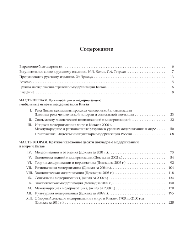 В книге подытожены материалы 10 ежегодных докладов (2001—2010 гг.), подготовленных Центром исследования модернизации и Группой исследования стратегий модернизации Китая, специалистами, работающими в Китайской академии наук (директор Центра и руководитель Группы — профессор Хэ Чуаньци). В первой части книги в широком цивилизационном контексте представлены данные о состоянии и тенденциях модернизации в 131 стране мира, включая Россию. Авторы различают две исторические стадии модернизации — первичную, при переходе к индустриальному обществу, и вторичную, при переходе к обществу, основанному на знаниях. Китайские специалисты разработали способы измерения состояния и динамики каждой стадии модернизации; они используют единые для всех стран индикаторы, сведенные по специальной методике в три индекса: для каждой из двух стадий и для интегрированной оценки обеих стадий.