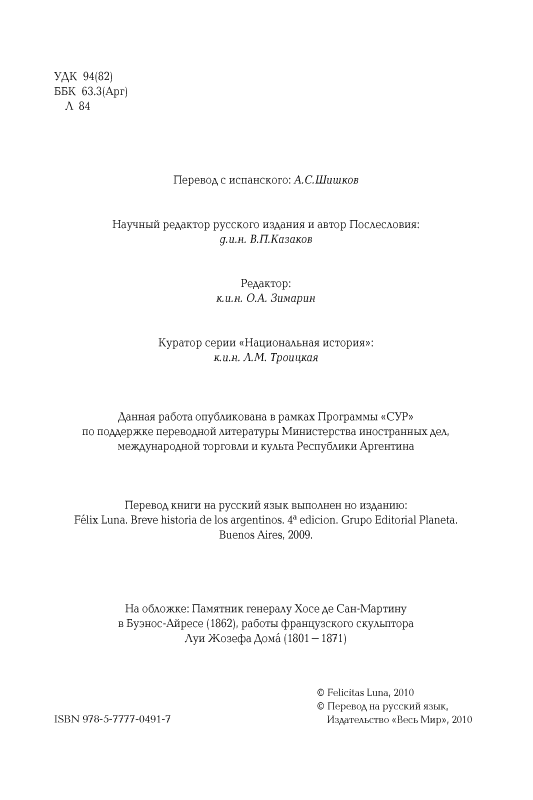 К двухсотлетнему юбилею обретения независимости Аргентины издательство «Весь Мир» приурочило издание на русском языке книги выдающегося аргентинского историка, журналиста, писателя и поэта Феликса Луны (1925–2009). Автор многочисленных работ по истории своей страны, Луна написал эту сравнительно небольшую книгу, не ставя своей задачей детальное описание аргентинской истории. Его главной целью было изучение истории становления аргентинского народа, выявление основных тенденций исторического развития молодой и энергичной страны.
