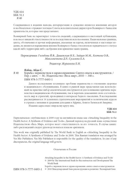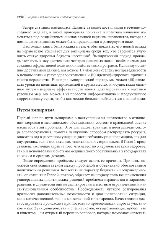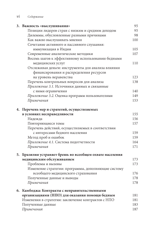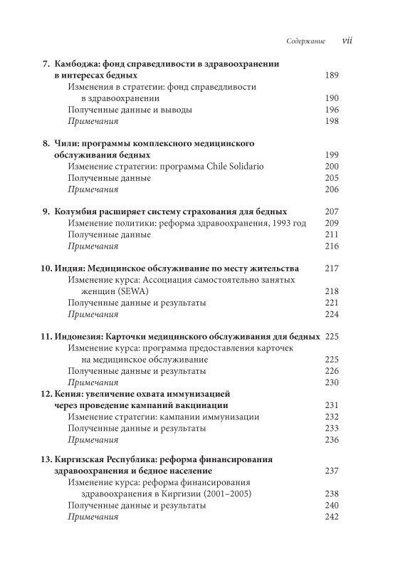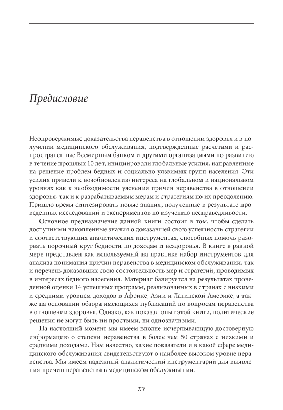 Данное исследование посвящено проблеме неравенства в отношении здоровья и медицинского обслуживания. В книге в равной мере представлен как используемый на практике набор аналитических инструментов для понимания причины неравенства в медицинском обслуживании, так и перечень доказавших свою состоятельность мер и стратегий, проводимых в интересах бедного населения. В исследовании рассматриваются 14 успешных стратегических мероприятий и политических курсов в странах с низкими и средними доходами в Африке, Азии и Латинской Америке.