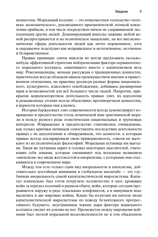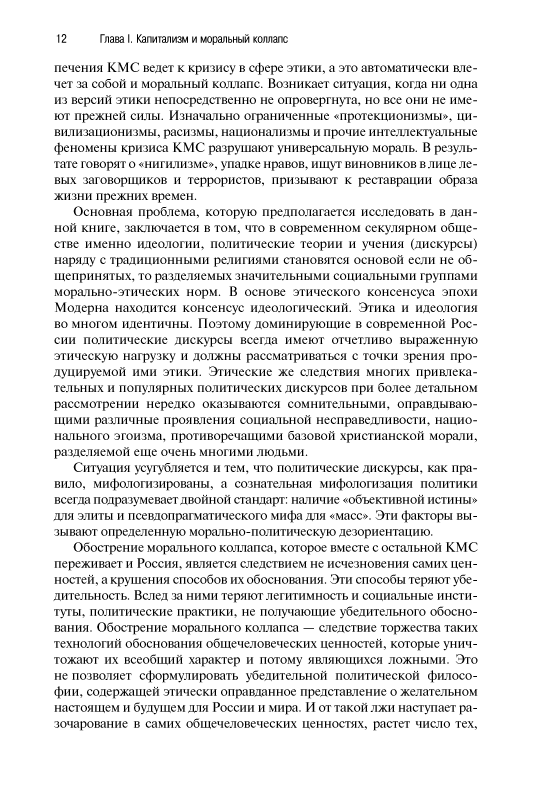 В центре внимания исследования — фактор «морального коллапса» (И. Валлерстайн), изначально присущий капиталистической миросистеме. Этот фактор оказывает серьезное влияние на моральное и политическое настоящее России. Кроме того распад биполярного мира и возвращение России в капиталистическую миросистему совпали с истощением морального импульса легитимировавшего ее политического проекта Модерна. Авторы рассматривают историю основных модерновых идеологий, политических теорий и дискурсов как непрерывный поиск путей «идеологического обеспечения» существования людей в условиях забвения базовых внеэкономических общечеловеческих ценностей.