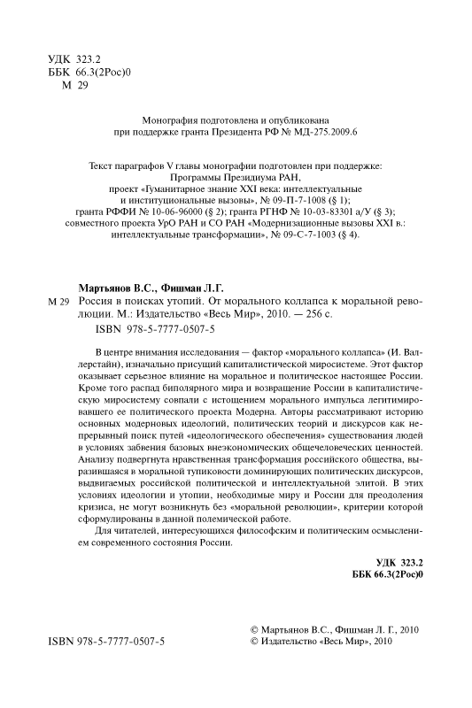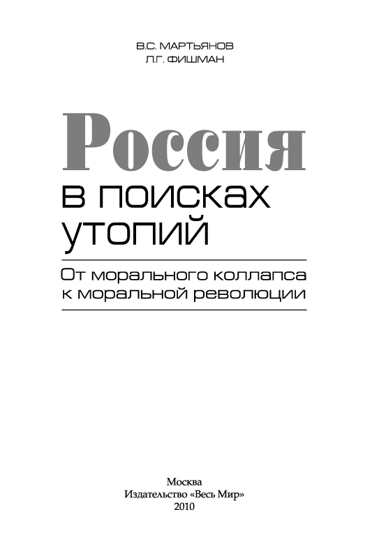 Вышла в свет книга уральских политологов В.С.Мартьянова и Л.Г. Фишмана «Россия в поисках утопий. От морального коллапса к моральной революции».