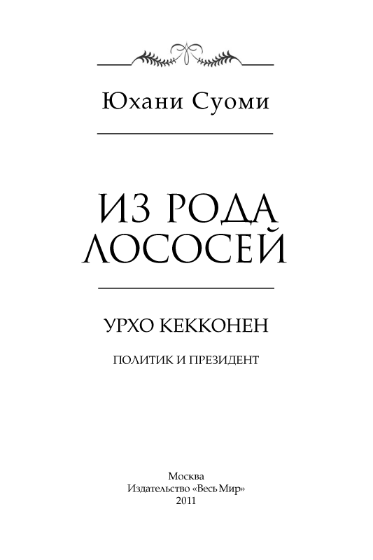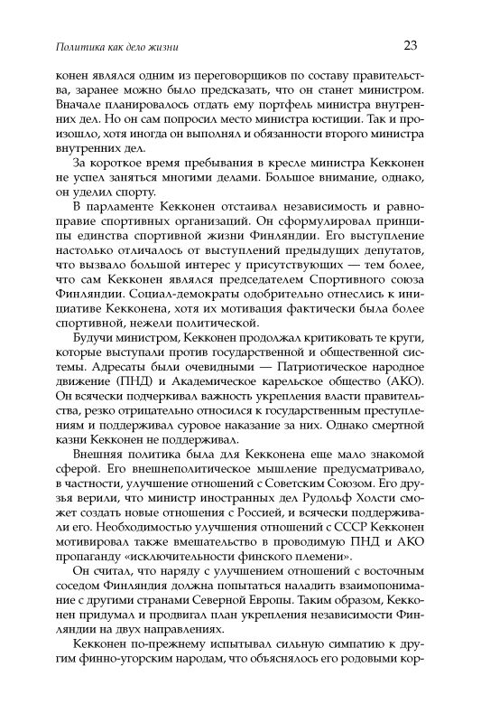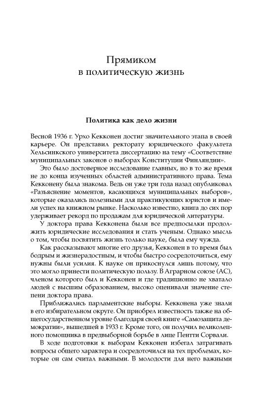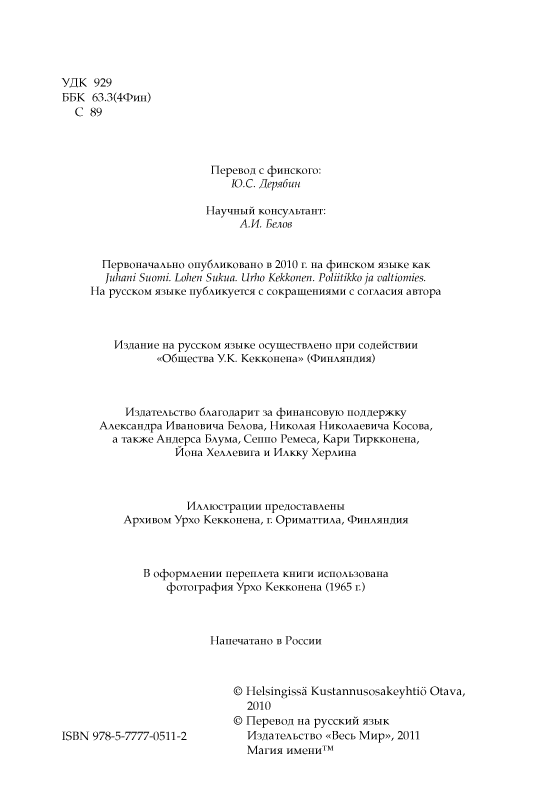 Урхо Кекконен относится к числу выдающихся мировых политических деятелей ХХ в. Придя в политику в начале 1930-х гг., Кекконен в дальнейшем неоднократно входил в состав правительства Финляндии и четырежды избирался на пост президента страны (1956–1982). С именем Кекконена связано установление особых отношений между Финляндией и СССР, способствовавших не только успешному развитию двух стран-соседей, но и проведению Совещания по безопасности и сотрудничеству в Европе (1975). Хельсинкский Заключительный акт этого Совещания сыграл огромную роль в судьбах Европы и мира. Будучи яркой личностью, человеком многогранных талантов, Урхо Кекконен своей деятельностью вдохновлял и восхищал одних, вызывал раздражение и подозрения других. Настоящая книга, написанная к 110-летию со дня рождения Кекконена наиболее крупным знатоком его биографии профессором Юхани Суоми, дает возможность составить самостоятельное мнение об этом выдающемся человеке. Русское издание книги сопровождается предисловиями посла СССР в Финляндии В.С. Степанова и первого российского посла в этой стране Ю.С. Дерябина. С согласия автора русское издание книги выходит в свет с некоторыми сокращениями.