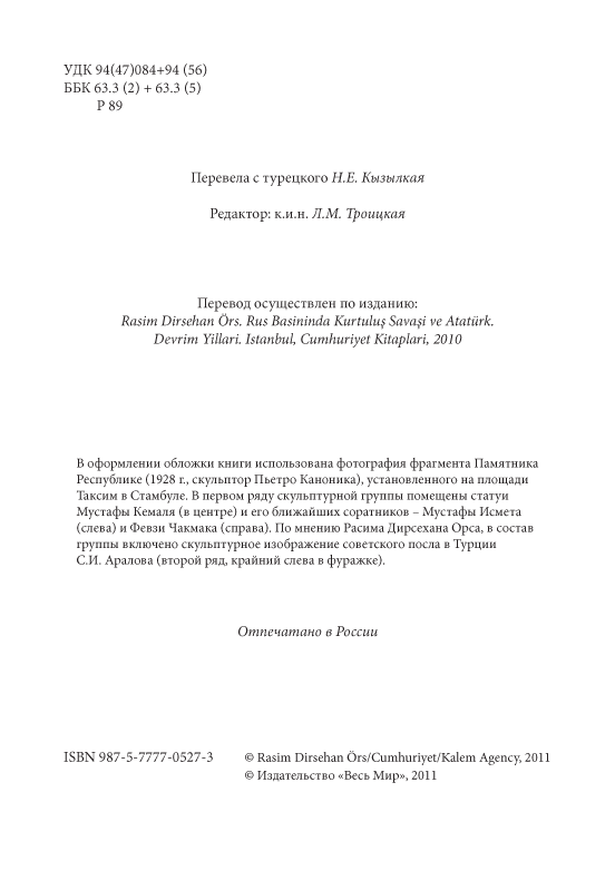В 2009 г. этой книге была присуждена авторитетной в Турции газетой «Джумхурийет» премия им. Юнуса Нади (в номинации «Общественные науки»). Ее автор Расим Дирсехан Орс является, пожалуй, первым турецким исследователем, изучавшим отношения между Турцией и Россией в 1920-х гг. сквозь призму советской прессы того времени. В книге использованы не только тексты, но и разнообразные, уникальные фотографии, карикатуры и рисунки из советских газет и журналов. Новаторский подход позволил турецкому автору увлекательно и доступно рассказать о том, как два народа, сломав многовековые, зачастую враждебные, представления друг о друге, смогли построить новые взаимовыгодные отношения дружбы и поддержки. Особое внимание автор уделяет вопросу о том, почему личность и политика Мустафы Кемаль-паши (Ататюрка) были столь важны для Советской России и почему даже сегодня актуален подход этого выдающегося политического деятеля к общим проблемам Евразии. В книге убедительно показано, насколько точно острые вопросы почти вековой давности перекликаются с современностью.