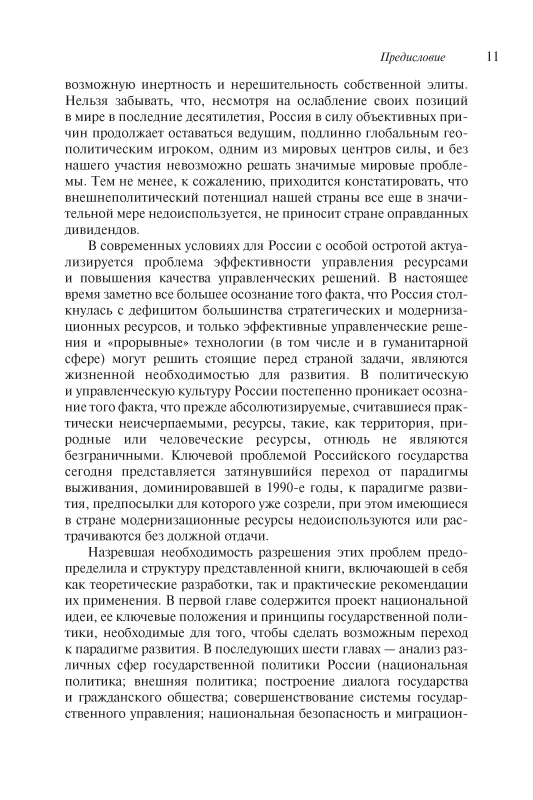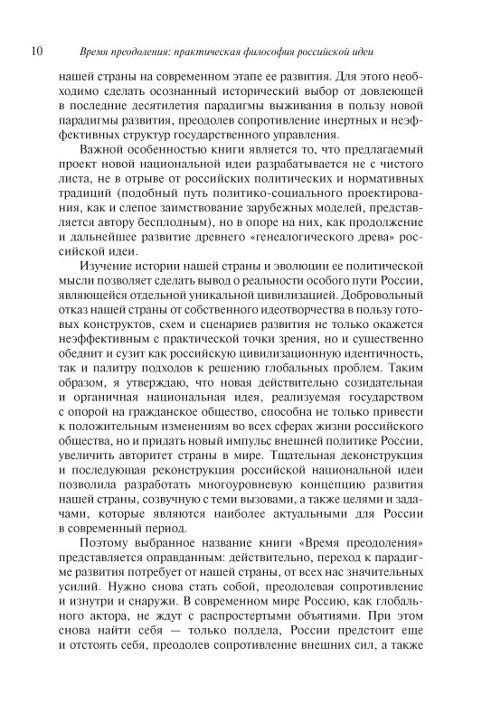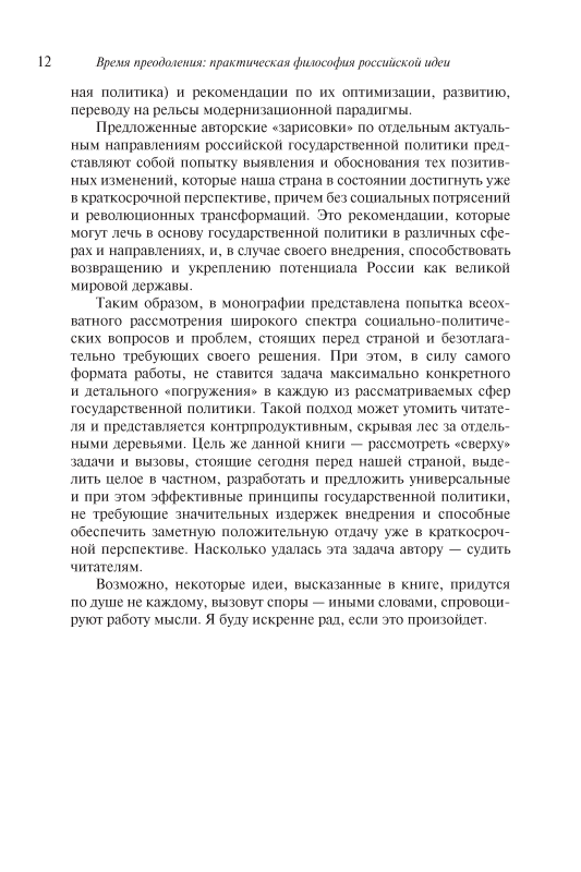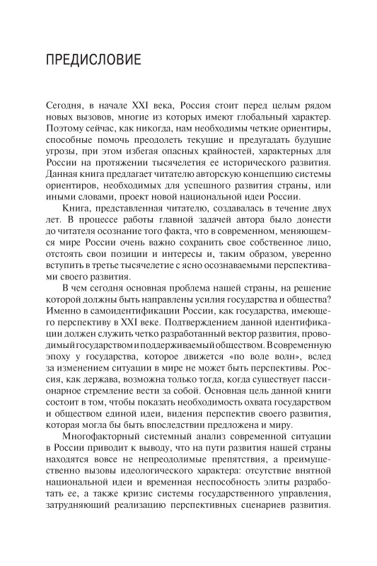 В книге предложено авторское видение российской национальной идеи в диалектическом процессе ее развертывания. Показывается, что на пути развития нашей страны находятся преимущественно вызовы идеологического характера: отсутствие внятной национальной идеи и временная неспособность элиты разработать ее, а также кризис системы государственного управления, делающий невозможным реализацию любых несистемных сценариев развития. Автор показывает, что преодоление этих негативных сдерживающих факторов является важной и осуществимой задачей для нашей страны. Для этого необходимо сделать осознанный исторический выбор от довлеющей в последние десятилетия парадигмы выживания в пользу новой парадигмы развития, преодолев сопротивление инертных и неэффективных структур государственного управления. Определение новой российской национальной идеи позволило автору разработать многоуровневую концепцию развития нашей страны.