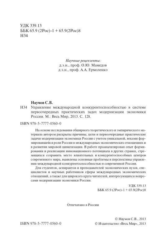 Для студентов, аспирантов и преподавателей экономических вузов, специалистов и научных работников сферы международных экономических отношений, а также для широкого круга читателей, интересующихся вопросами модернизации экономики России.