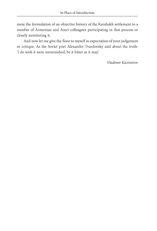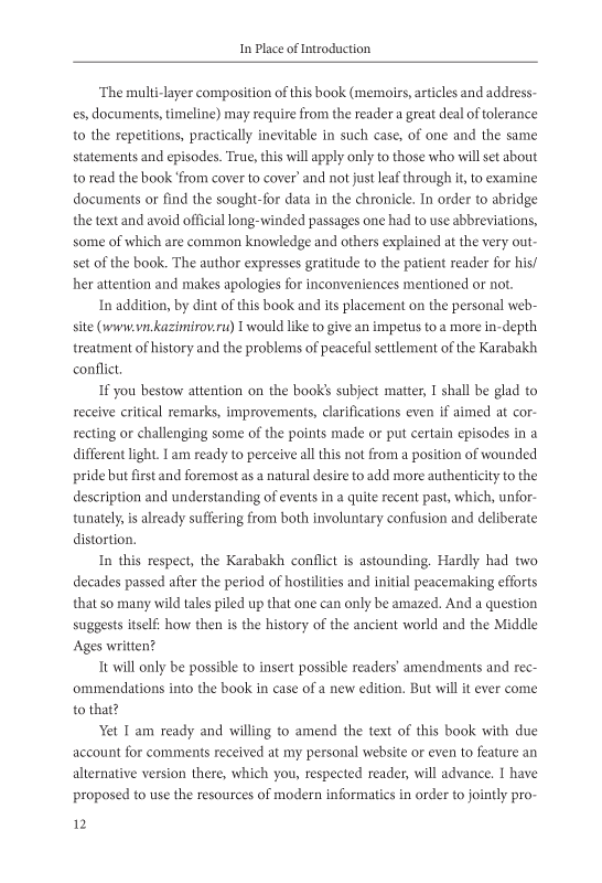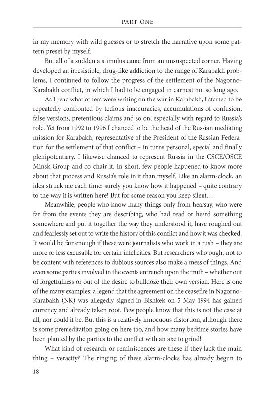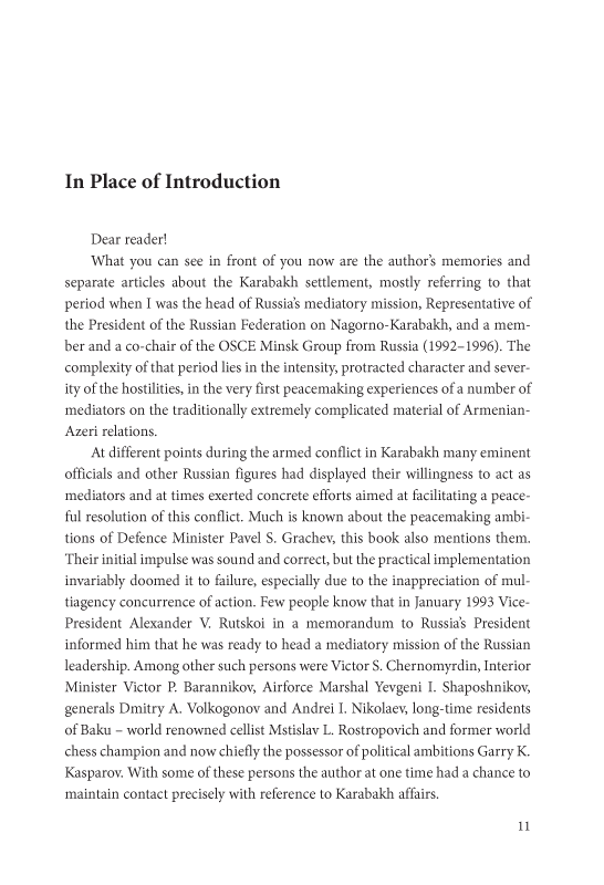 - Dear reader! What you can see in front of you now are the author’s memories and separate articles about the Karabakh settlement, mostly referring to that period when I was the head of Russia’s mediatory mission, Representative of the President of the Russian...