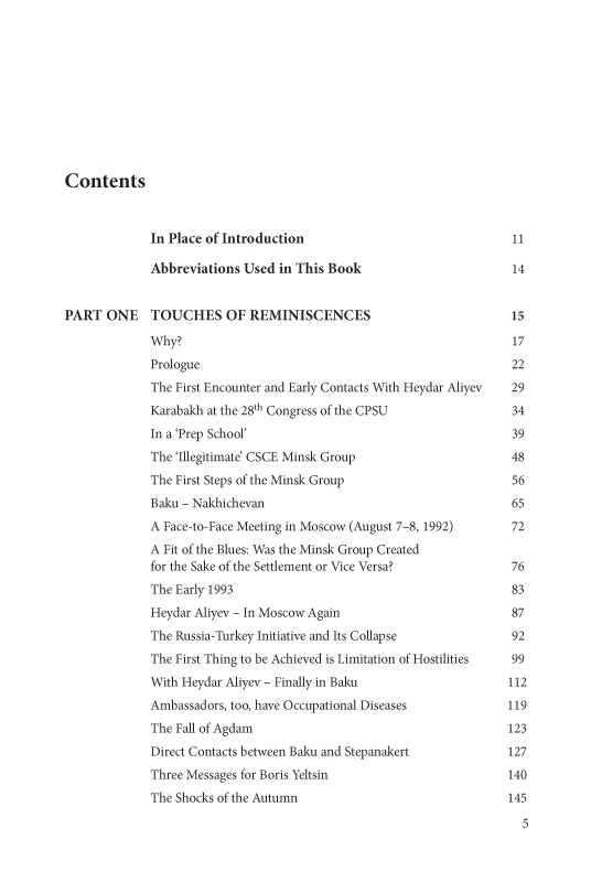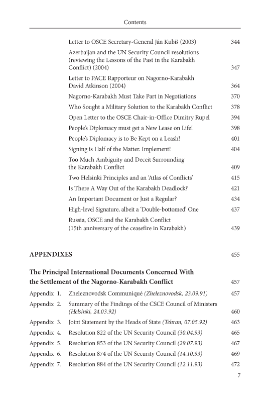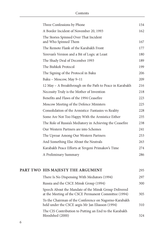 The book incorporates the author’s articles and statements on the Karabakh conflict. The appendix contains international documents on the settlement of the conflict, as well as documents on Russia’s mediation and a timeline of Karabakh settlement.