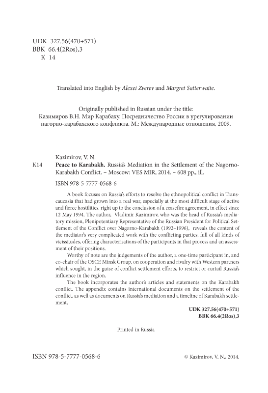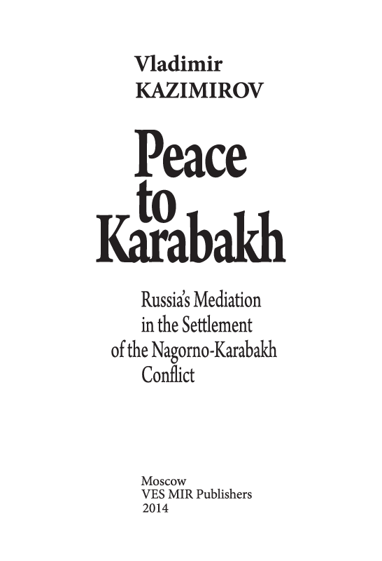 A book focuses on Russia’s efforts to resolve the ethnopolitical conflict in Transcaucasia that had grown into a real war, especially at the most difficult stage of active and fierce hostilities, right up to the conclusion of a ceasefire agreement, in effect since 12 May 1994. The author, Vladimir Kazimirov, who was the head of Russia’s mediatory mission, Plenipotentiary Representative of the Russian President for Political Settlement of the Conflict over Nagorno-Karabakh (1992–1996), reveals the content of the mediator’s very complicated work with the conflicting parties, full of all kinds of vicissitudes, offering characterisations of the participants in that process and an assessment of their positions.