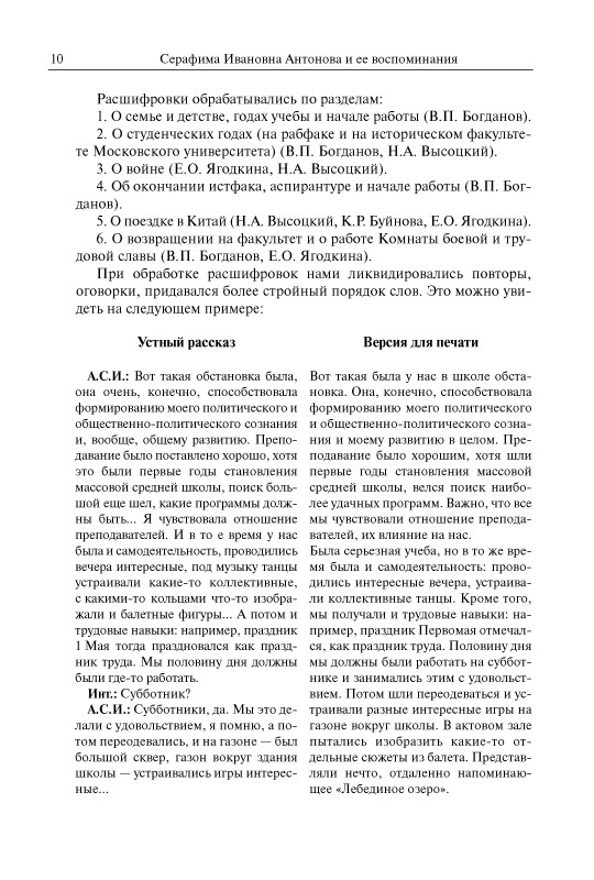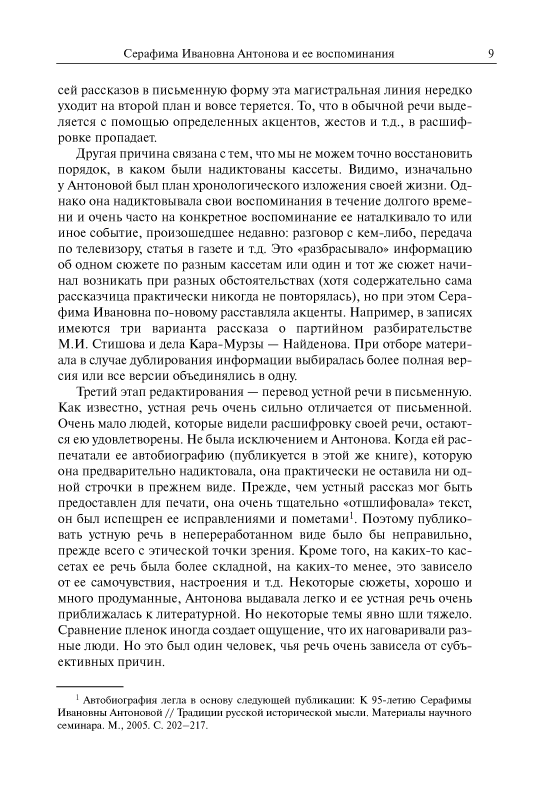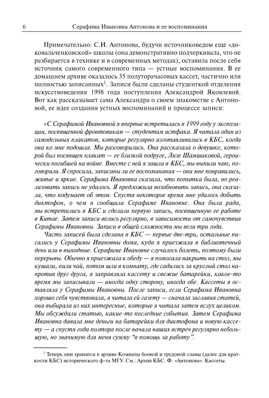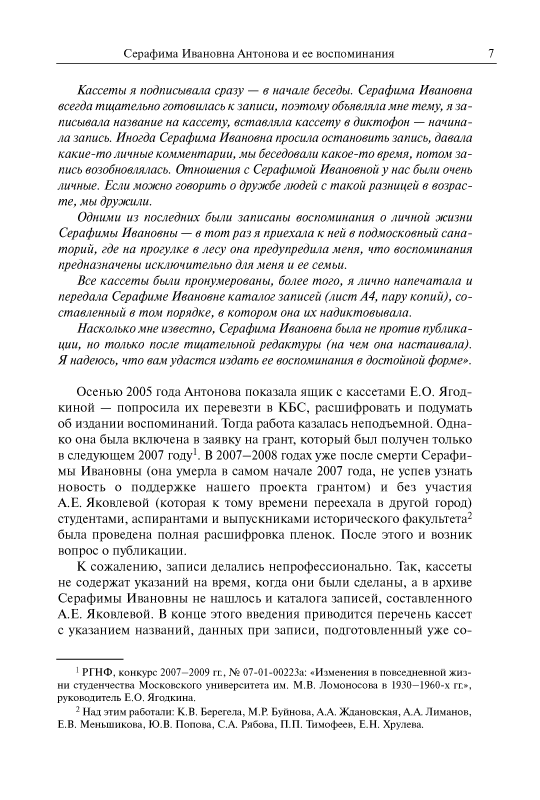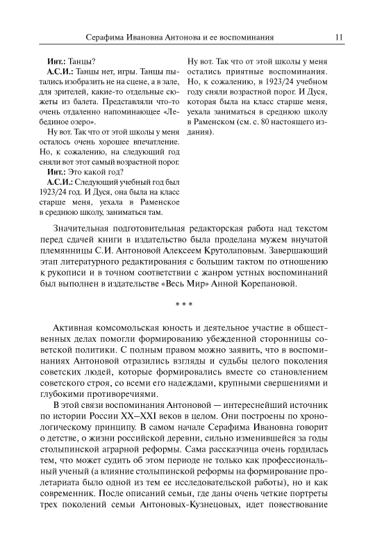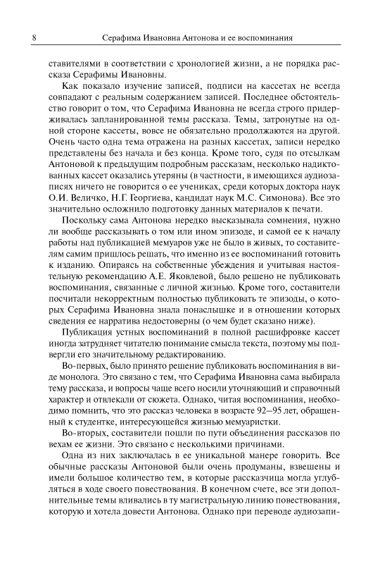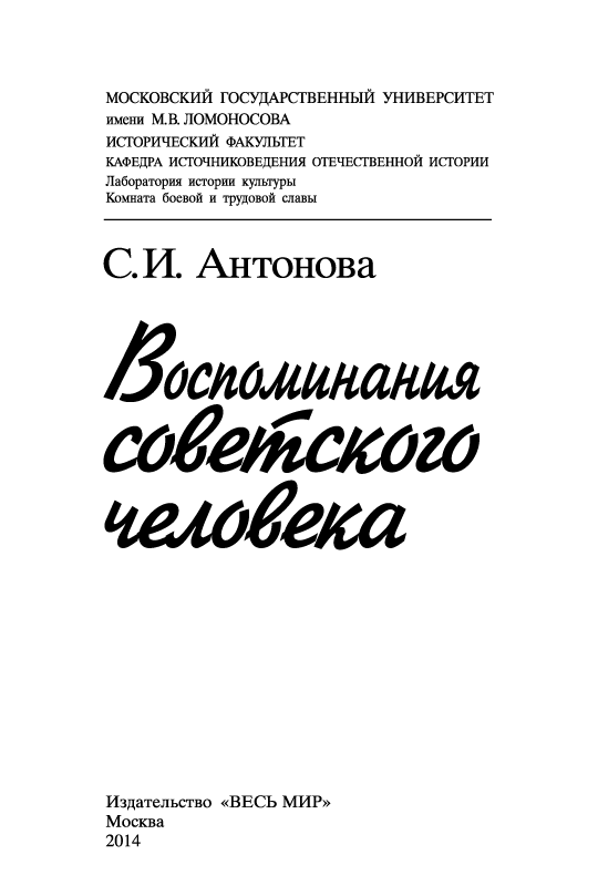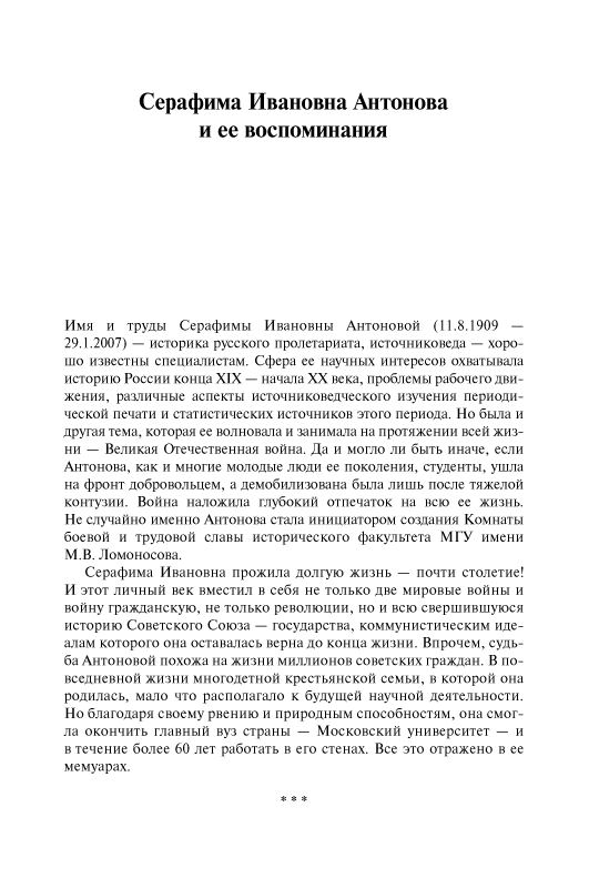 Серафима Ивановна Антонова (11.8.1909 – 29.1.2007) — историк русского пролетариата, источниковед, много лет проработавшая на историческом факультете МГУ имени М.В. Ломоносова, ветеран Великой Отечественной войны, создатель Комнаты боевой и трудовой славы исторического факультета. Прожив долгую жизнь, являясь участником ключевых событий отечественной истории XX в., она оставила подробные воспоминания, в которых отразились взгляды и судьбы целого поколения советских людей, сформировавшиеся вместе со становлением советского строя, со всеми его надеждами, крупными свершениями и глубокими противоречиями. Особое место в книге уделено поисковой работе С.И. Антоновой, связанной с увековечением памяти друзей и коллег — участников Великой Отечественной войны.