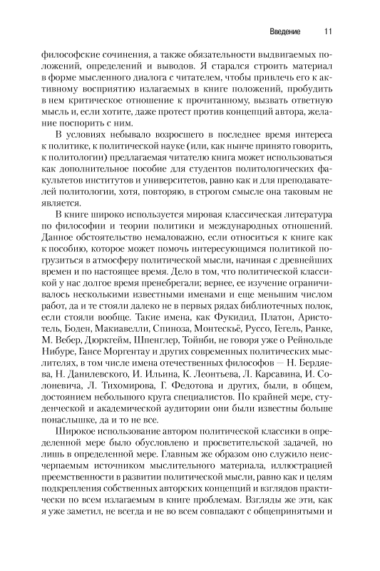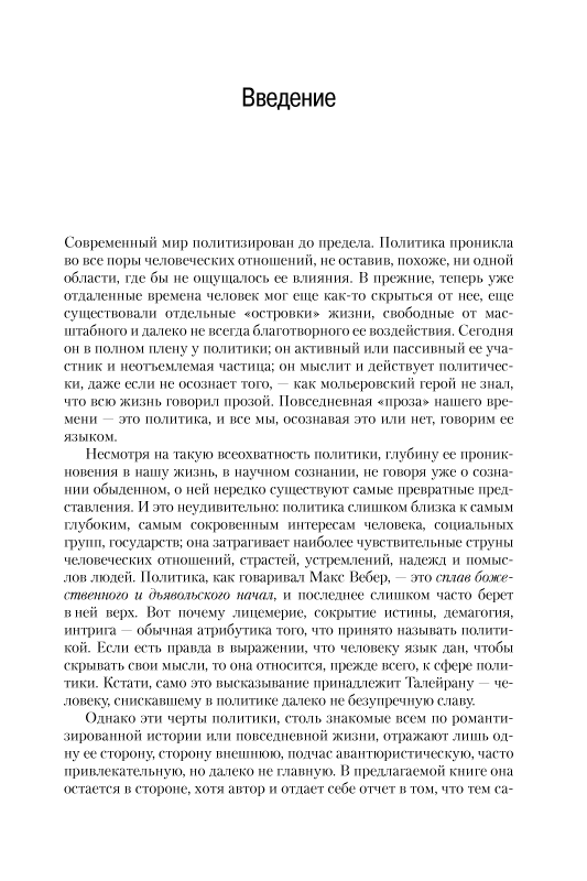 Автор не считает свою книгу ни учебником, ни научной монографией. Здесь представлено авторское, иногда полемически заостренное, понимание политики как полнейшего выражения социального бытия людей в ее наиболее существенных аспектах, подкрепленное суждениями великих философов, политических мыслителей и реальных политиков. Книгу отличает ясное изложение, глубина анализа и стремление с его помощью сделать более понятными драматичные события нашей внутренней и международной жизни.