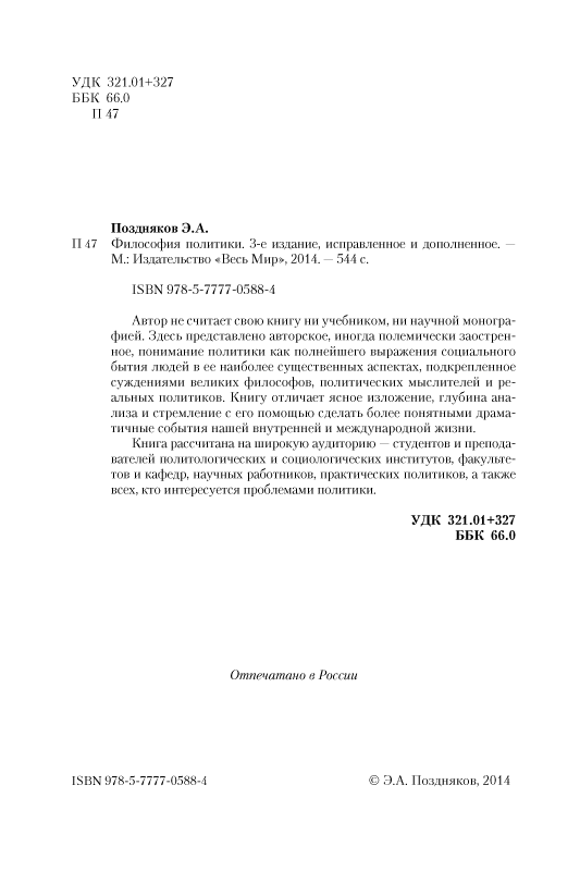 Книга рассчитана на широкую аудиторию — студентов и преподавателей политологических и социологических институтов, факультетов и кафедр, научных работников, практических политиков, а также всех, кто интересуется проблемами политики.