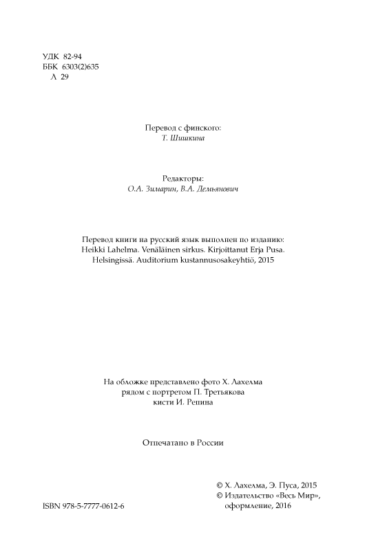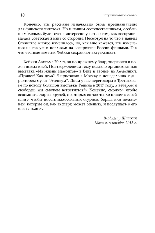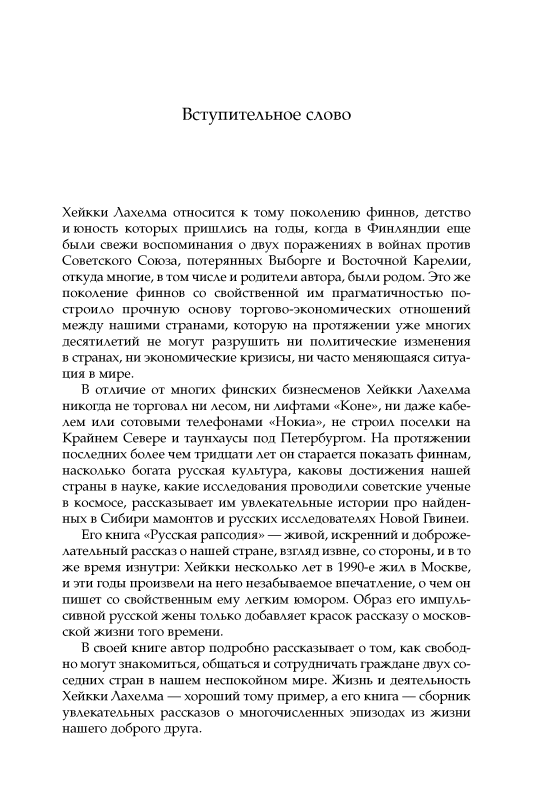 В развитии культурных взаимосвязей России и Финляндии в последние тридцать лет Хейкки Лахелма сыграл очень большую и в высшей степени позитивную роль. Судьбе было угодно, чтобы выпускник бизнес-колледжа стал одним из ведущих финских организаторов многочисленных научно-познавательных и художественных выставок совместно с учеными Академии наук СССР и России, специалистами лучших музеев Москвы, Ленинграда–Санкт-Петербурга, Киева, Еревана и других городов нашей страны. Эта подвижническая деятельность была столь успешной только благодаря дружной работе со многими замечательными людьми, с которыми Хейкки Лахелма свела жизнь: Андреем Капицей, Ильей Глазуновым, Ириной Родимцевой, Юрием Куклачевым и многими другими. О встречах с ними, о дружбе, о работе и жизни финнов в Москве, о непростых личных перипетиях, тесно переплетавшихся с драматическими событиями в истории СССР/России и Финляндии, повествует эта книга. Она написана с большой добротой к нашей стране и откровенностью, с теплым юмором. Автор делится своими наблюдениями над жизнью в СССР и России, которые многим из нас могут показаться неожиданными, но, безусловно, будут интересными и полезными. Книга снабжена фотоиллюстрациями.
