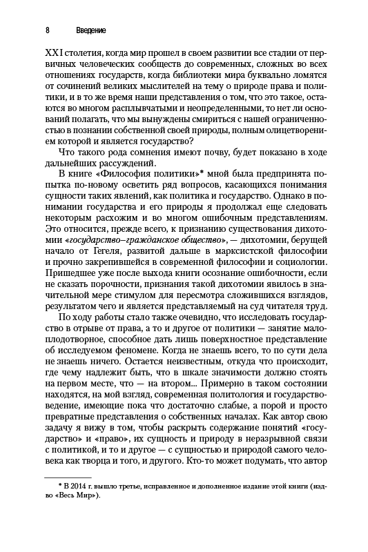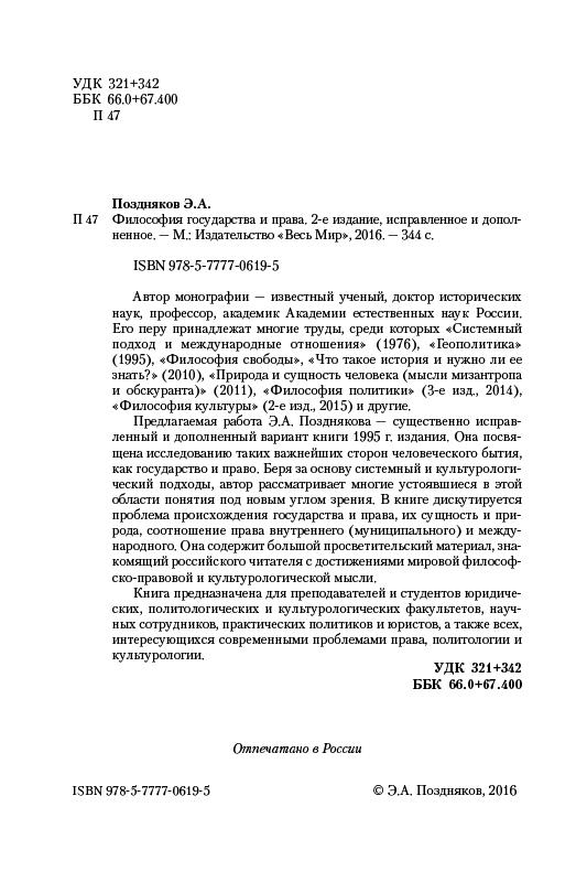 Предлагаемая работа Э.А. Позднякова — существенно исправленный и дополненный вариант книги 1995 г. издания. Она посвящена исследованию таких важнейших сторон человеческого бытия, как государство и право. Беря за основу системный и культурологический подходы, автор рассматривает многие устоявшиеся в этой области понятия под новым углом зрения. В книге дискутируется проблема происхождения государства и права, их сущность и природа, соотношение права внутреннего (муниципального) и международного. Она содержит большой просветительский материал, знакомящий российского читателя с достижениями мировой философско-правовой и культурологической мысли.