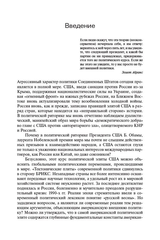 В предлагаемой читателю книге автор на основе многочисленных документов анализирует внешнеполитическую теорию американских неоконсерваторов, наиболее агрессивной части американской политической элиты. Американская исключительность, вера в особую миссию, ставка в мировых делах на силу и «экспорт демократии» – причины, объясняющие агрессивный характер американской внешней политики. На основе строгих и проверенных фактов автор анализирует «биографию» неоконсервативного движения от его зарождения до наших дней, прослеживает роль отдельных представителей этого движения на всех этапах американо-российских отношений. Книга открывает читателю малоизвестные страницы связи неоконсерваторов с российскими правозащитниками, позволяет глубже понять проблемы современных международных отношений. Адресована всем, кто интересуется проблемами международных отношений и современной политики.