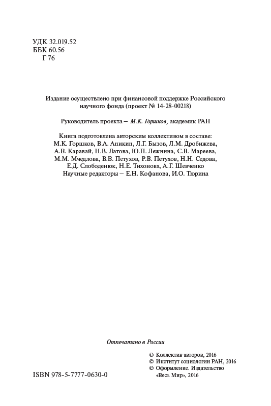 - Уважаемый читатель, перед вами — книга третья издательского цикла «Российское общество и вызовы времени», который осуществляется в рамках проекта Российского научного фонда (РНФ) учеными Института социологии Российской академии наук (ИС РАН) на основе анализа результатов общенациональных...
