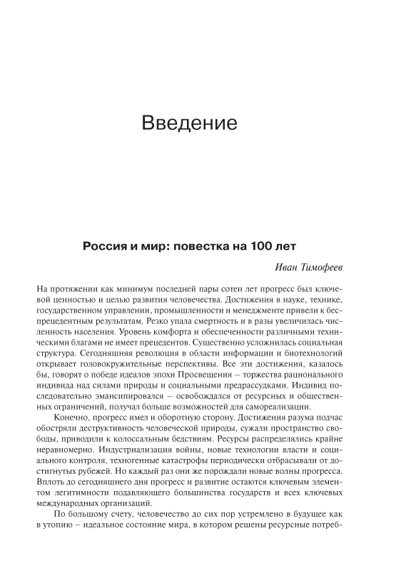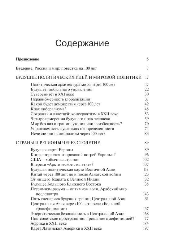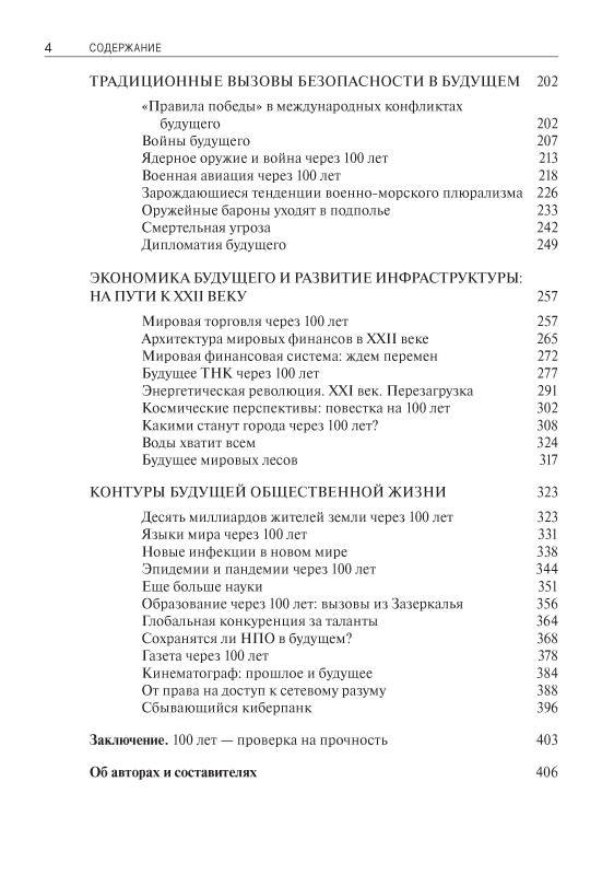 Издание включает в себя 55 статей, затрагивающих различные аспекты международной и общественной жизни в столетней перспективе. Прогнозы, сделанные авторами, указывают на ключевые тенденции развития человечества. Издание будет представлять интерес экспертам-международникам, госслужащим, журналистам и всем заинтересованным в изучении будущего и анализе долгосрочных мировых тенденций.